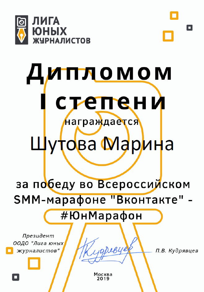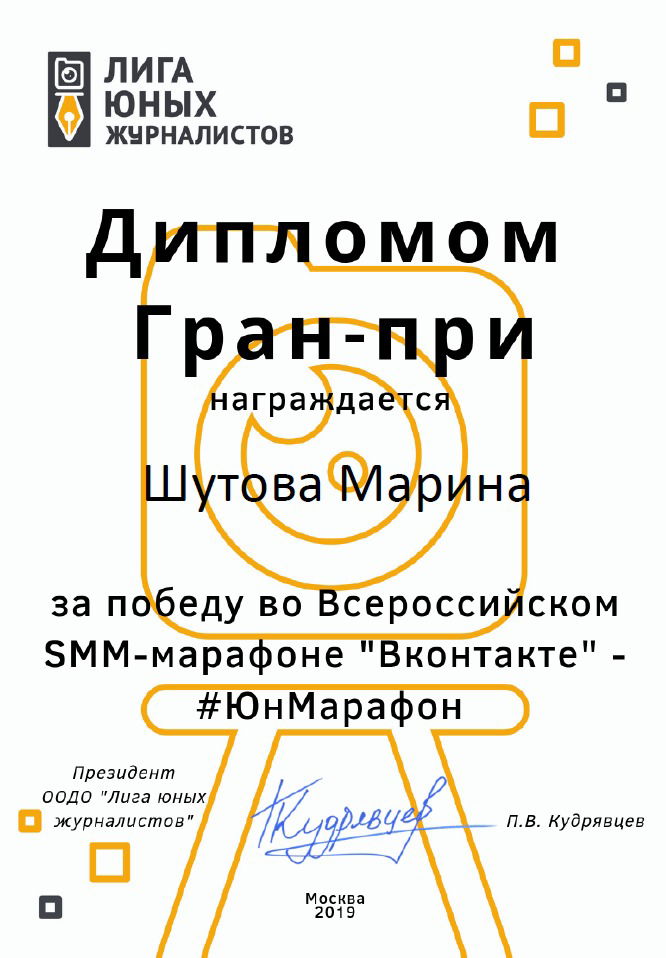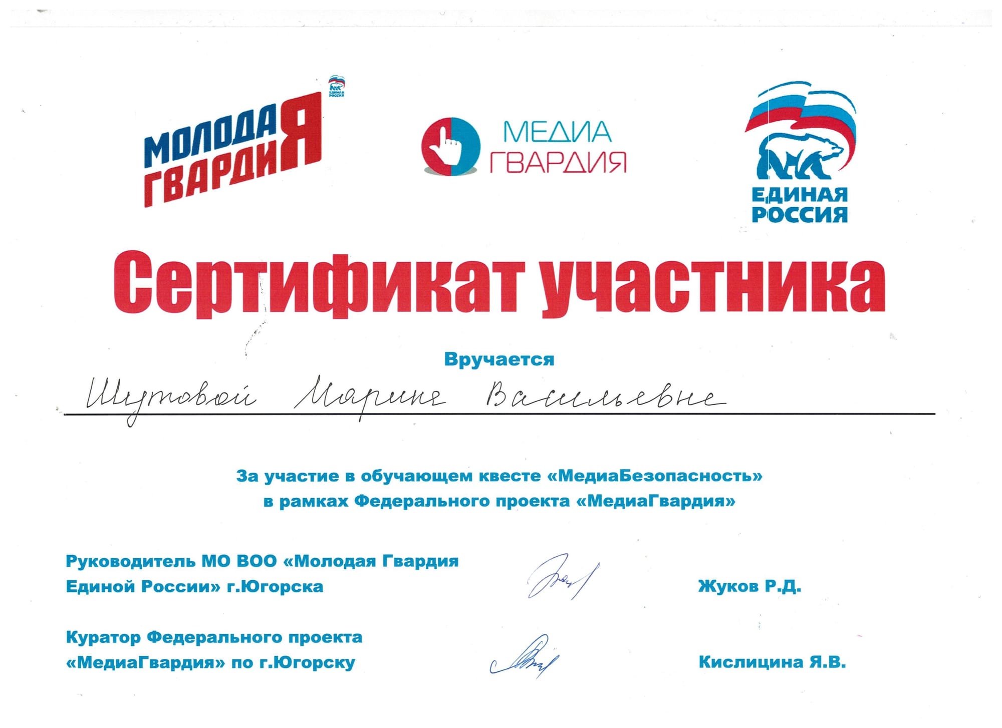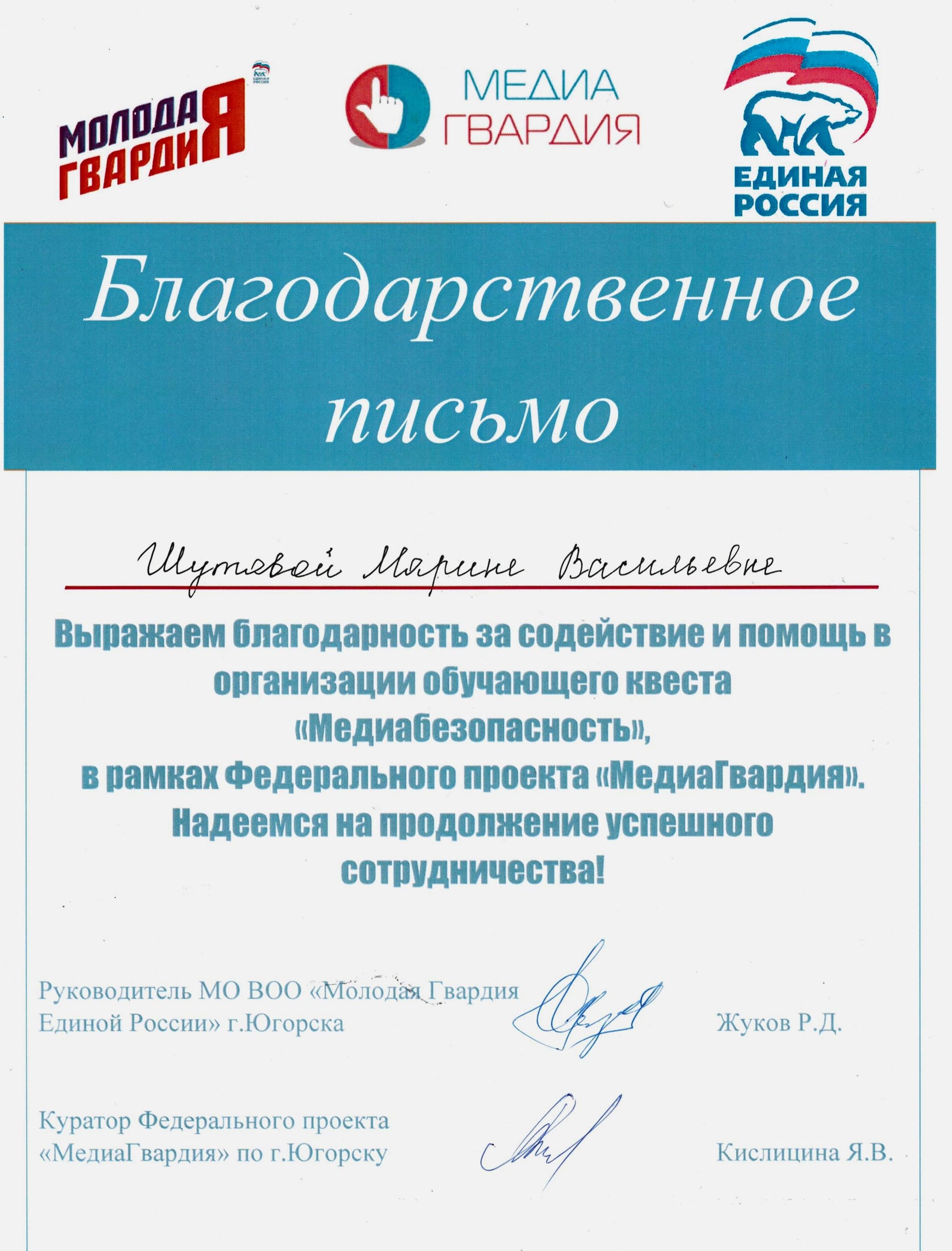 Благодарственное письмо руководителя МО ВОО «Молодая Гвардия» за содействие и помощь в организации обучающего квеста «МедиаБезопасность» в рамках Федерального проекта «МедиаГвардия»;