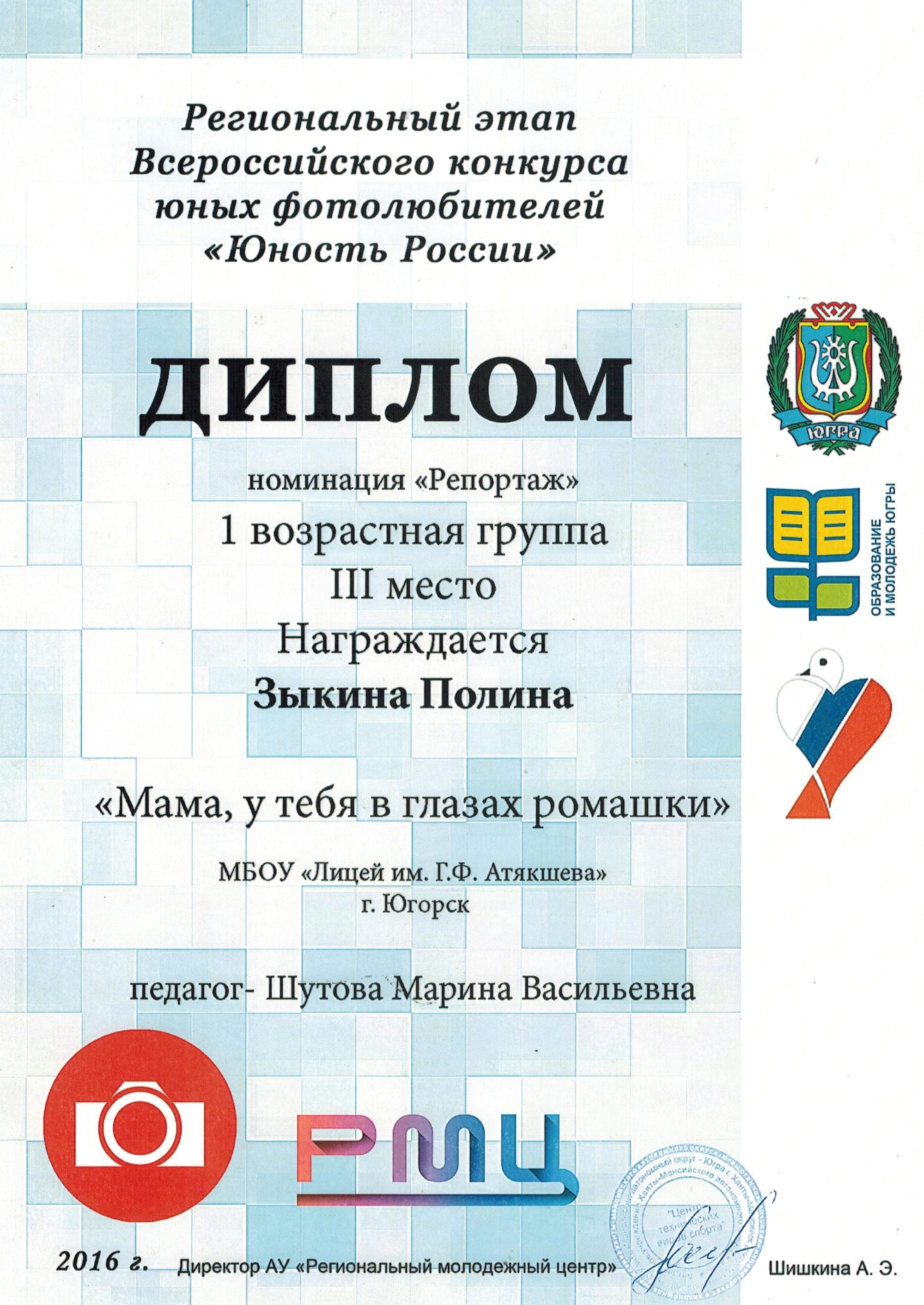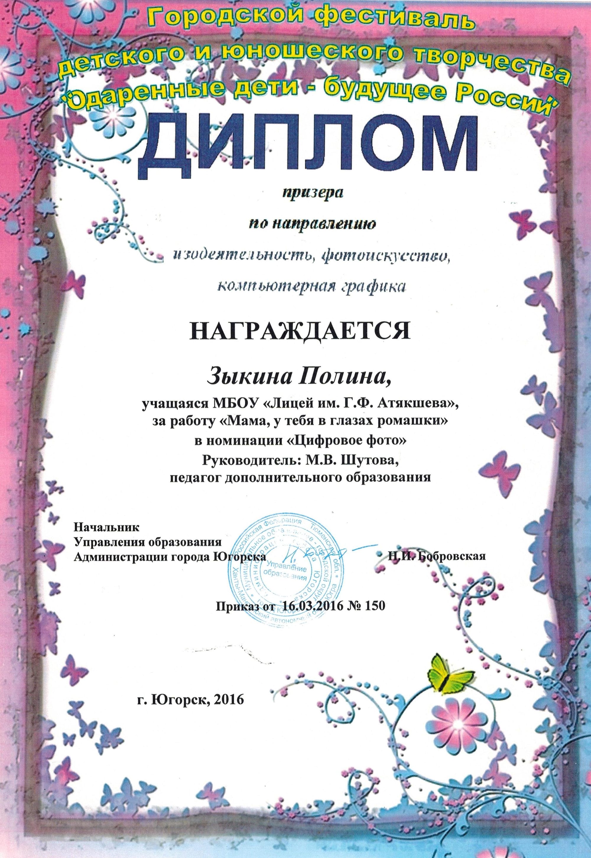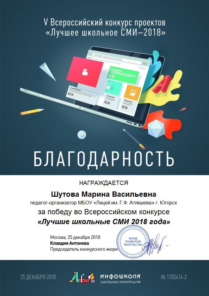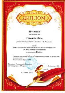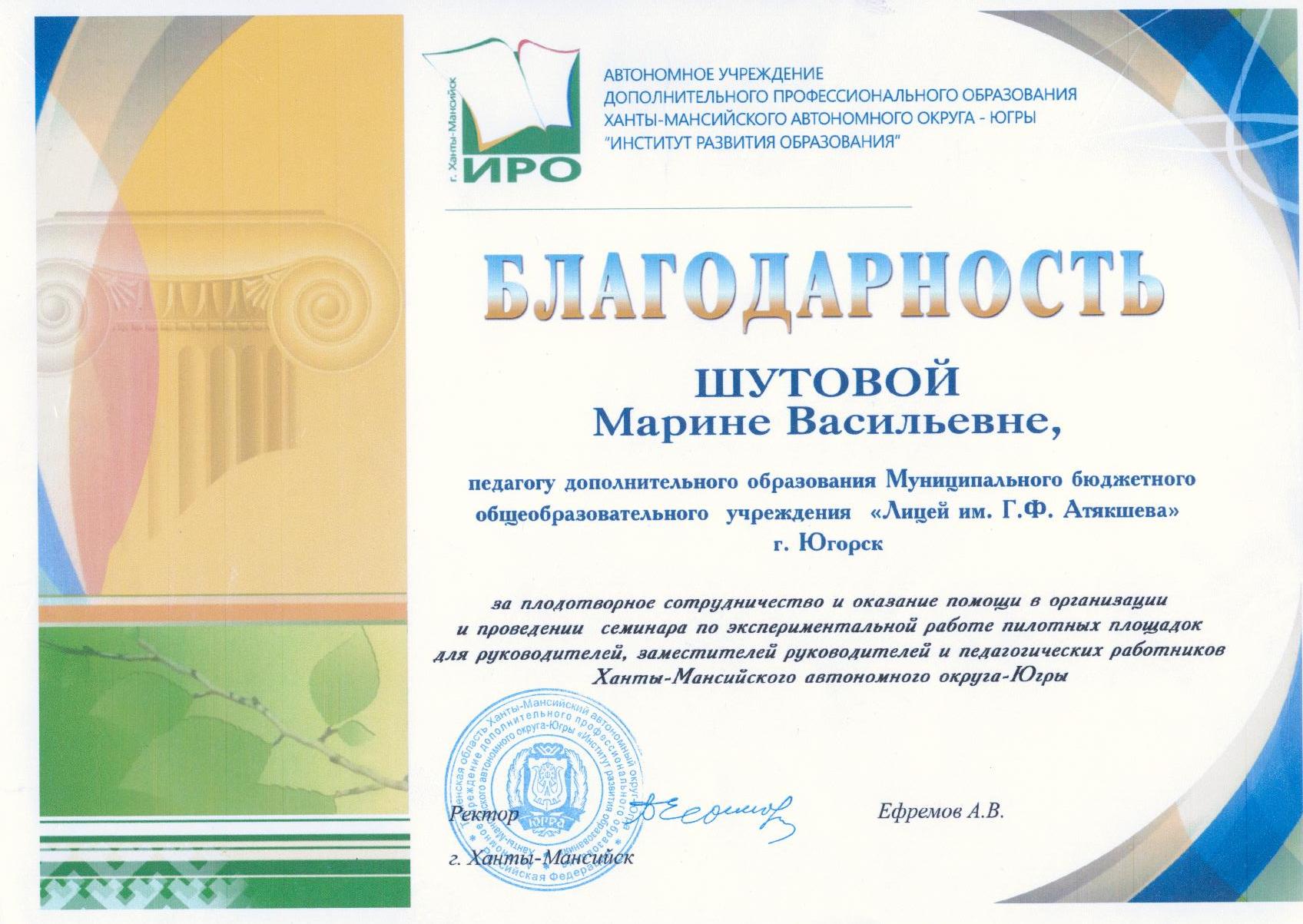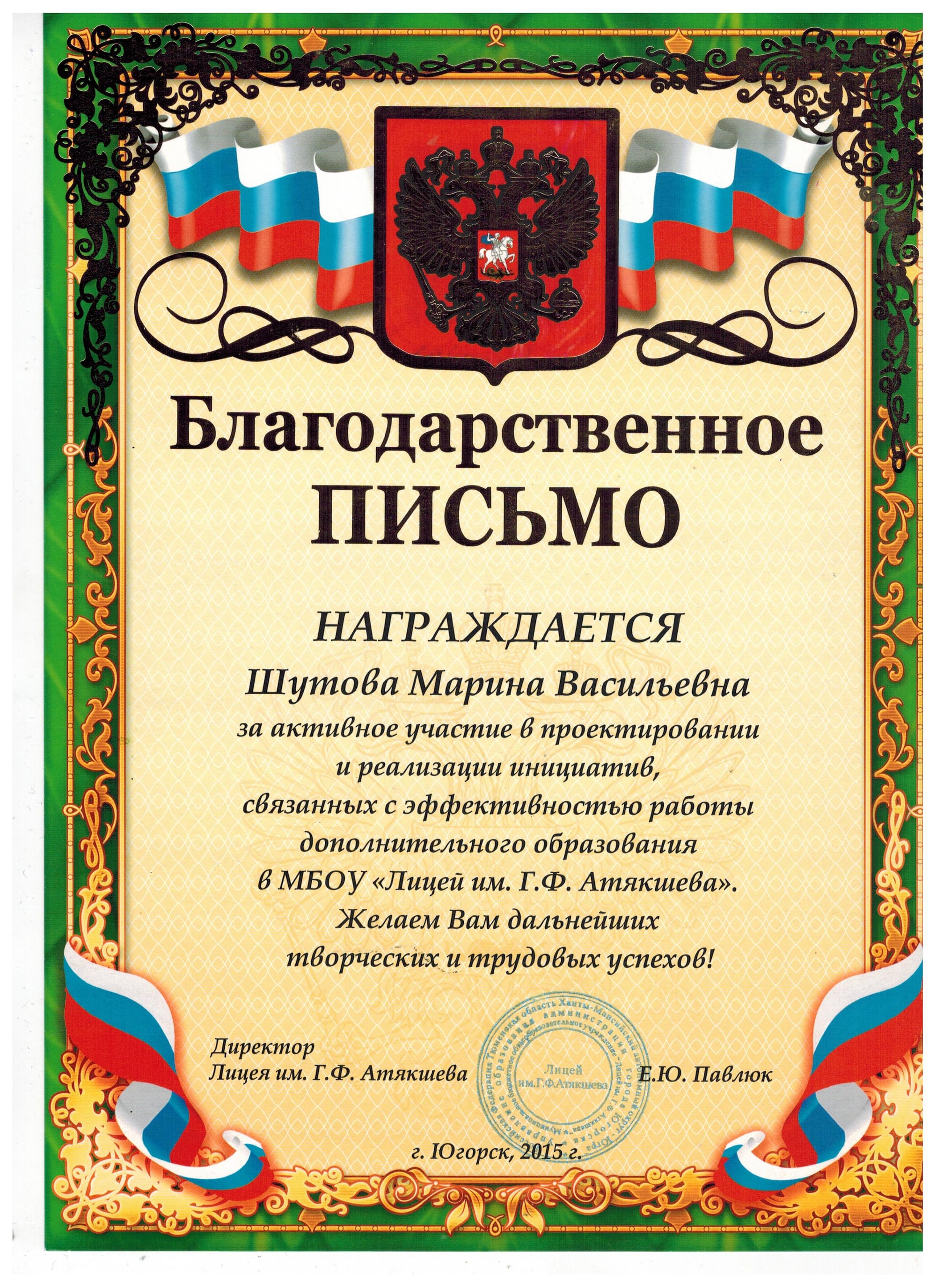 Благодарность директора Лицея им. Г.Ф. Атякшева за активное участие а проектировании и реализации инициатив, связанных с эффективностью работы дополнительного образования в МБОУ №Лицей им. Г.Ф. Атякшева»;