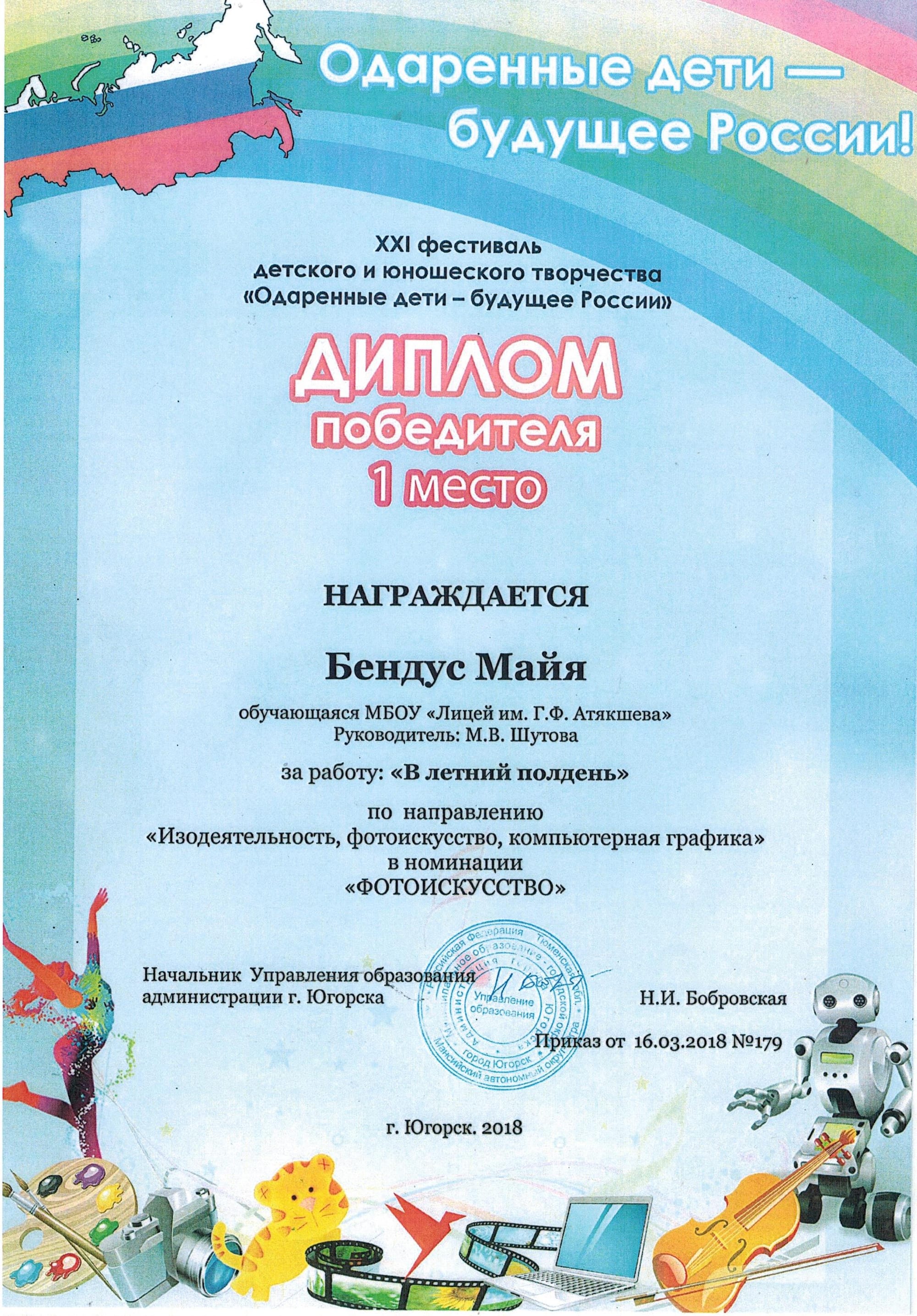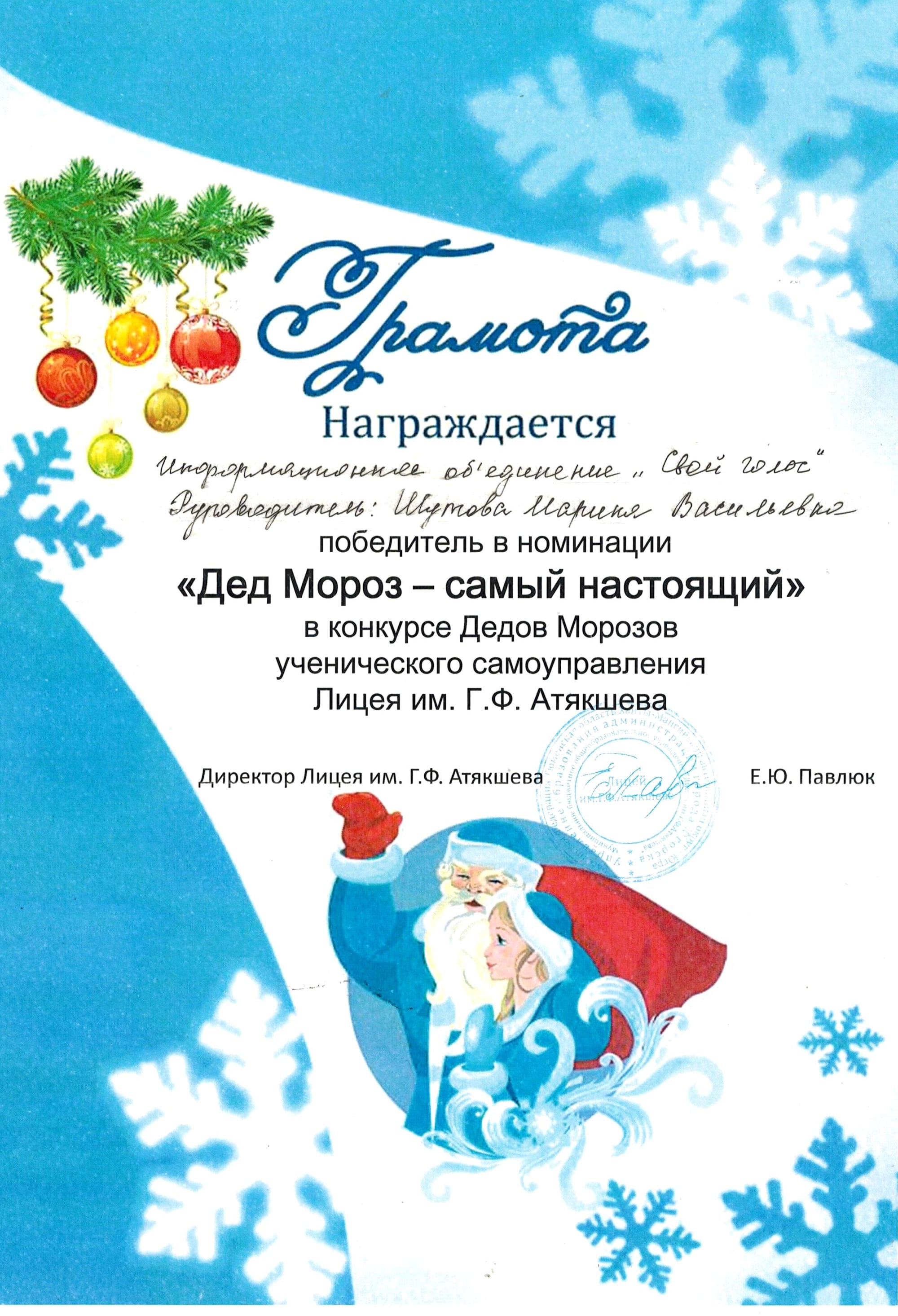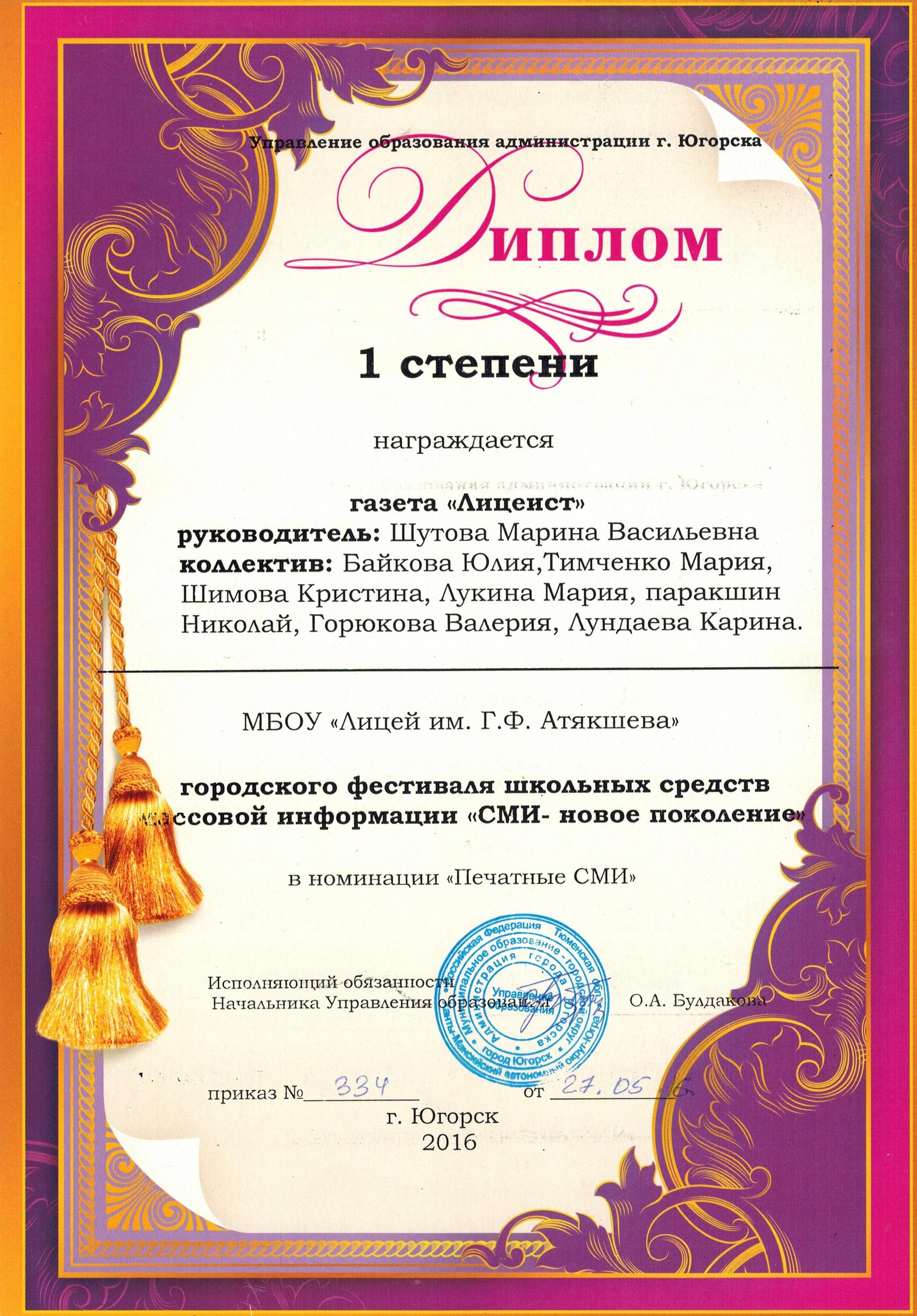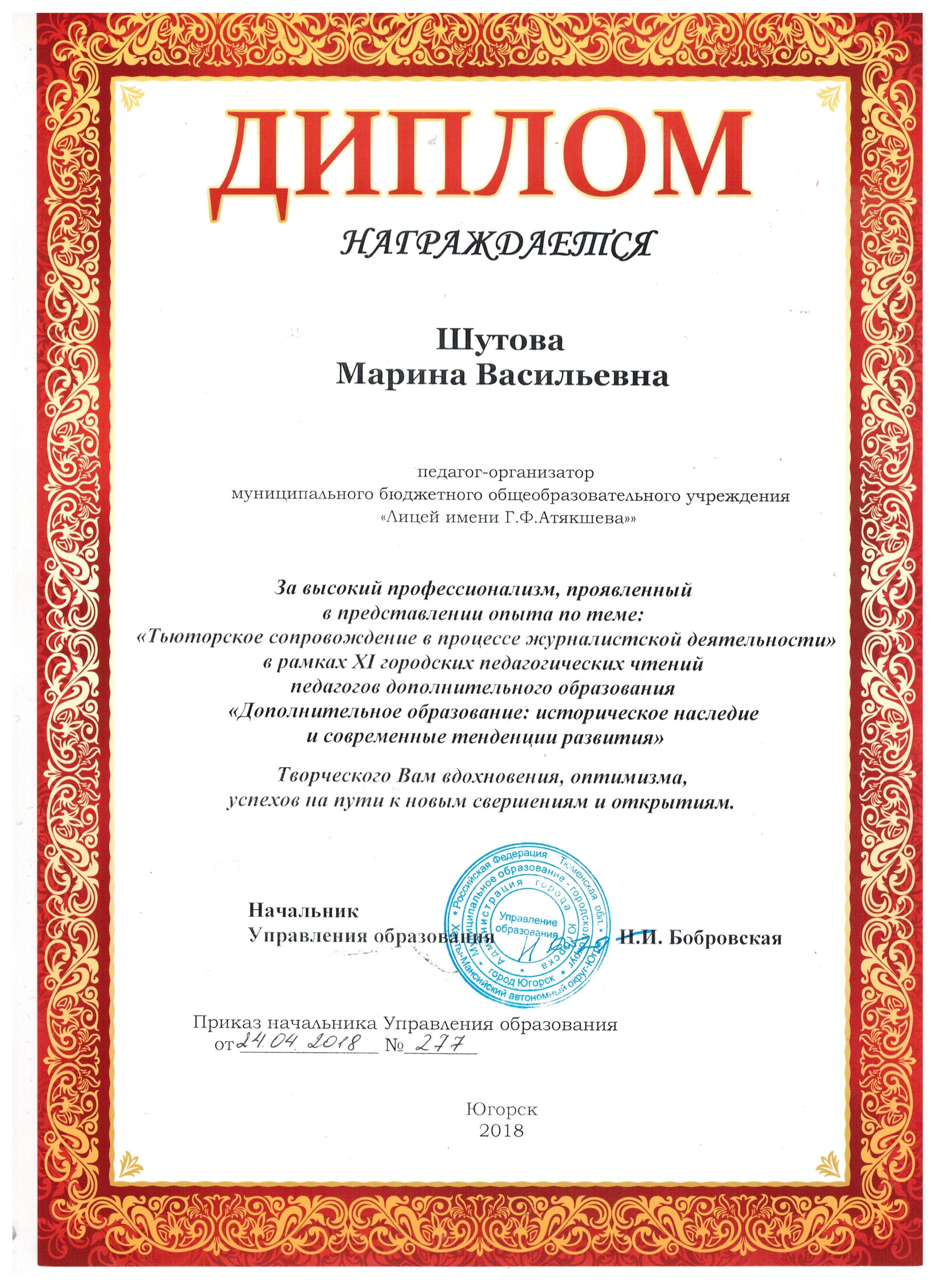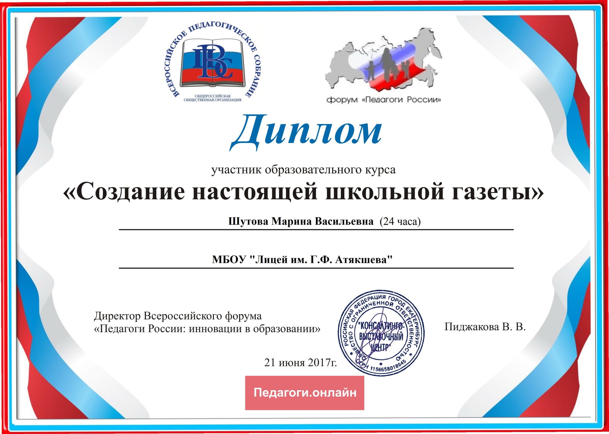 Благодарность директора Лицея им. Г.Ф. Атякшева за активное участие а проектировании и реализации инициатив, связанных с эффективностью работы дополнительного образования в МБОУ №Лицей им. Г.Ф. Атякшева»;