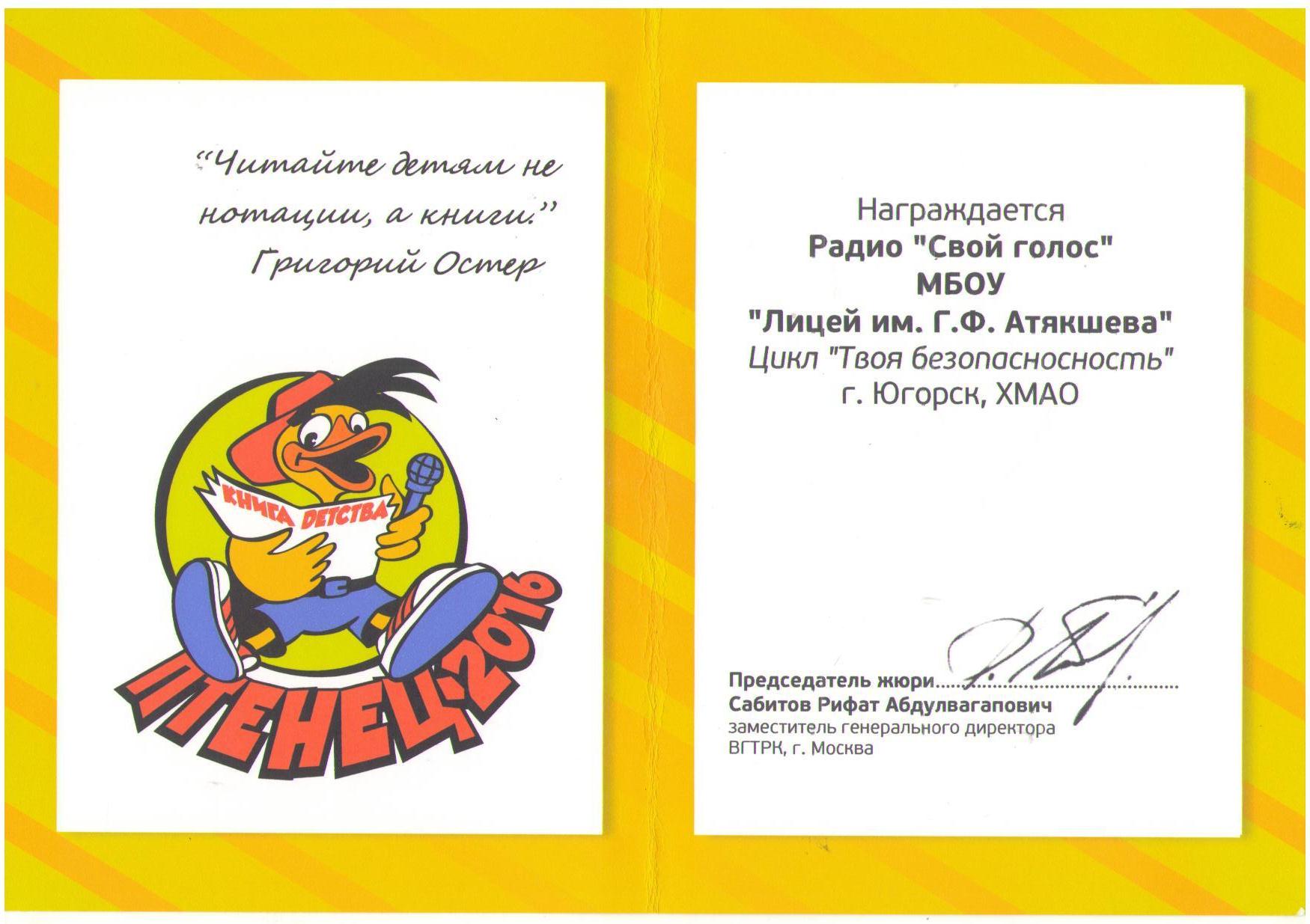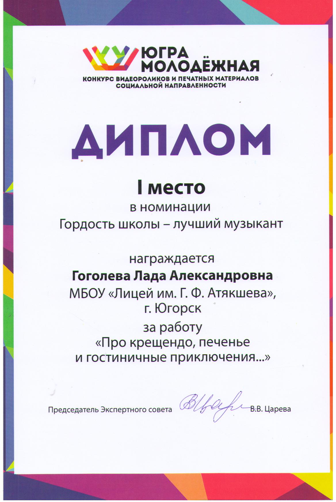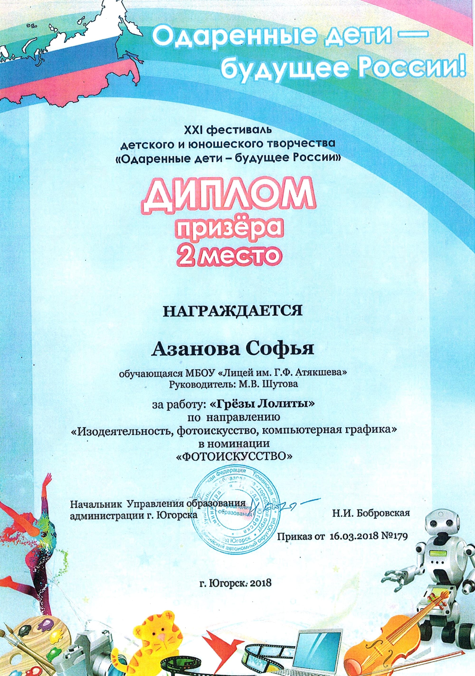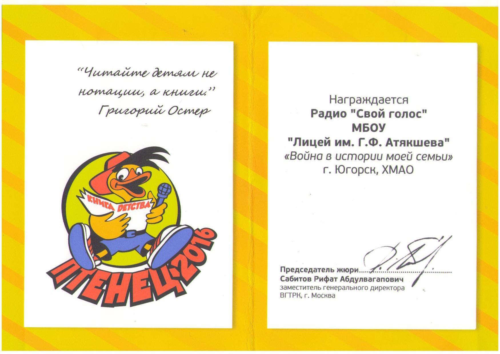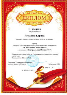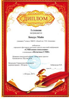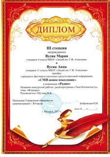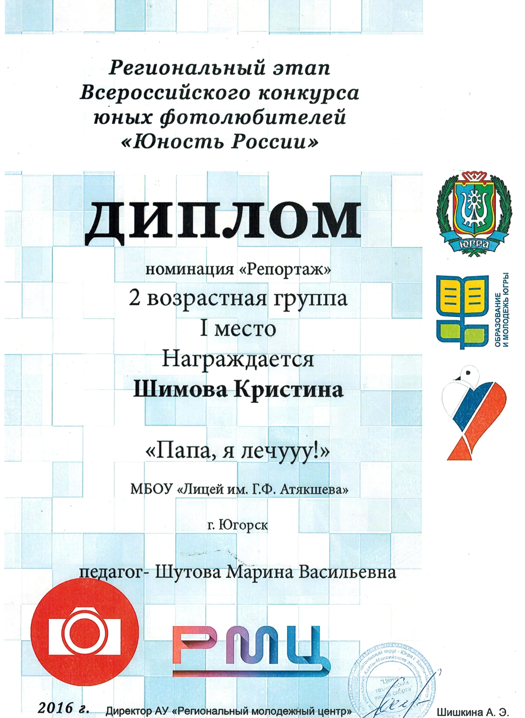 Благодарность директора Лицея им. Г.Ф. Атякшева за активное участие а проектировании и реализации инициатив, связанных с эффективностью работы дополнительного образования в МБОУ №Лицей им. Г.Ф. Атякшева»;