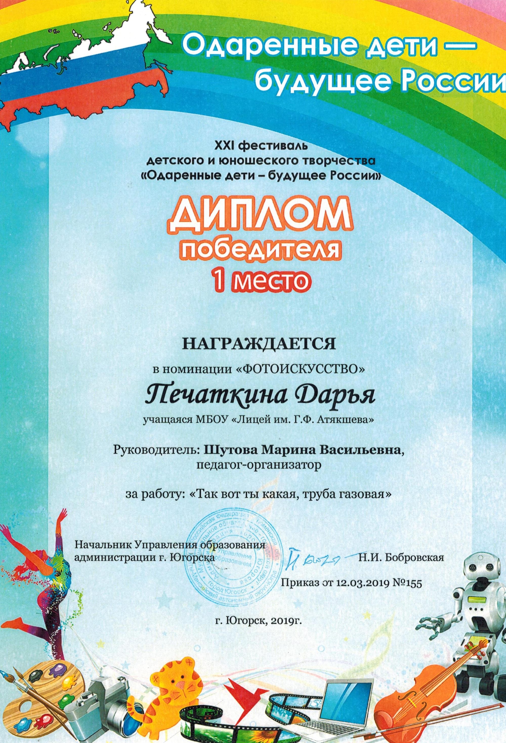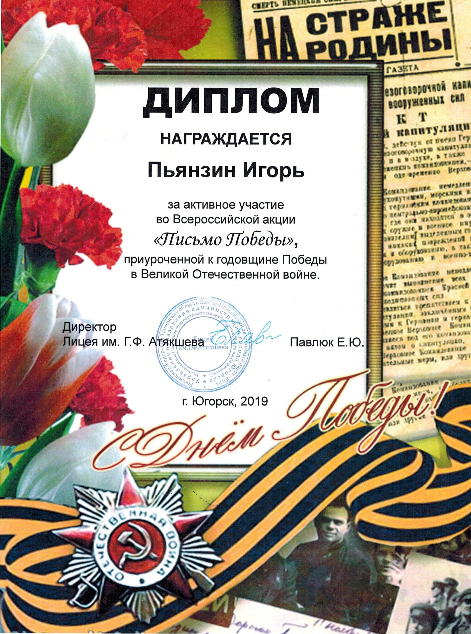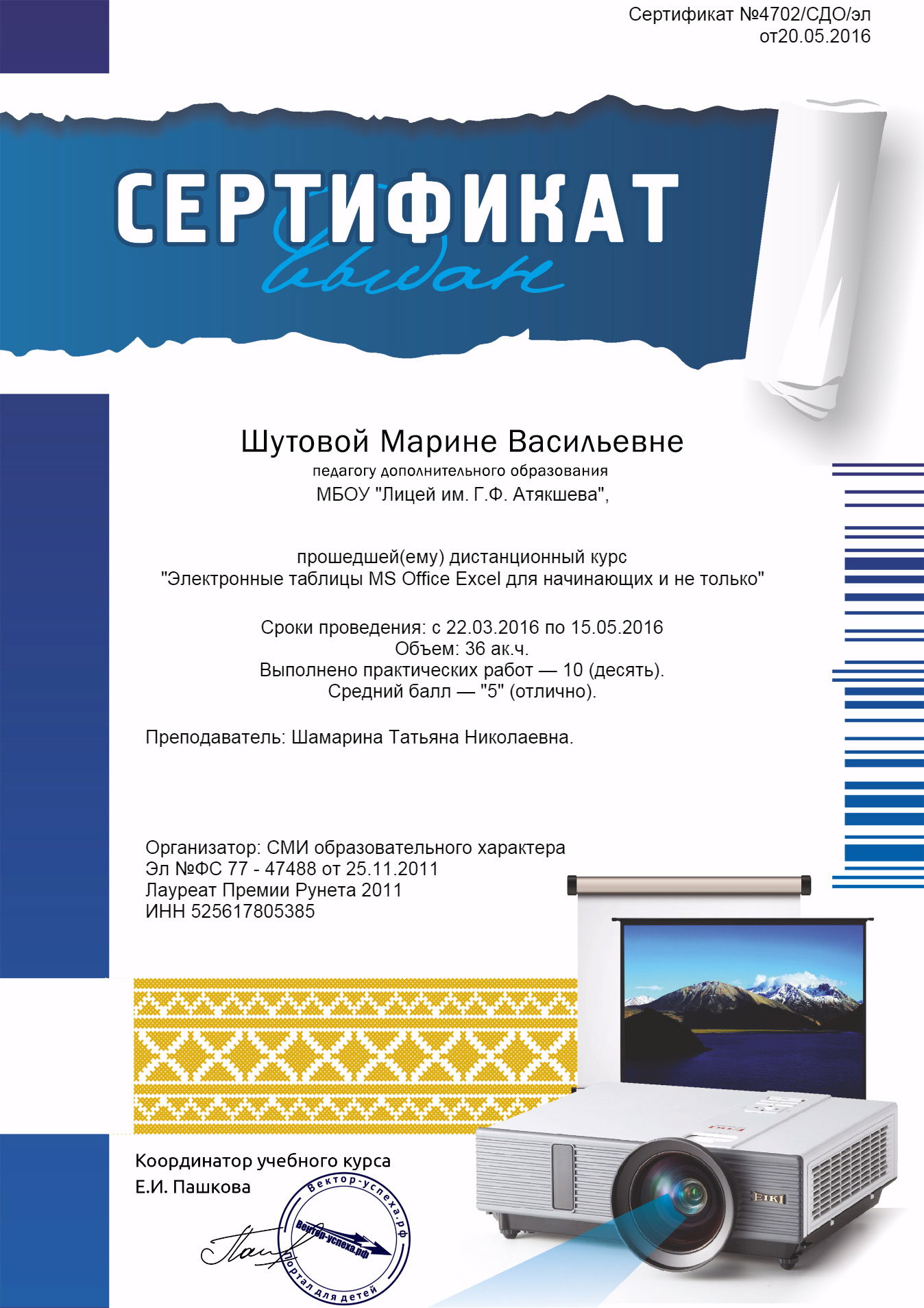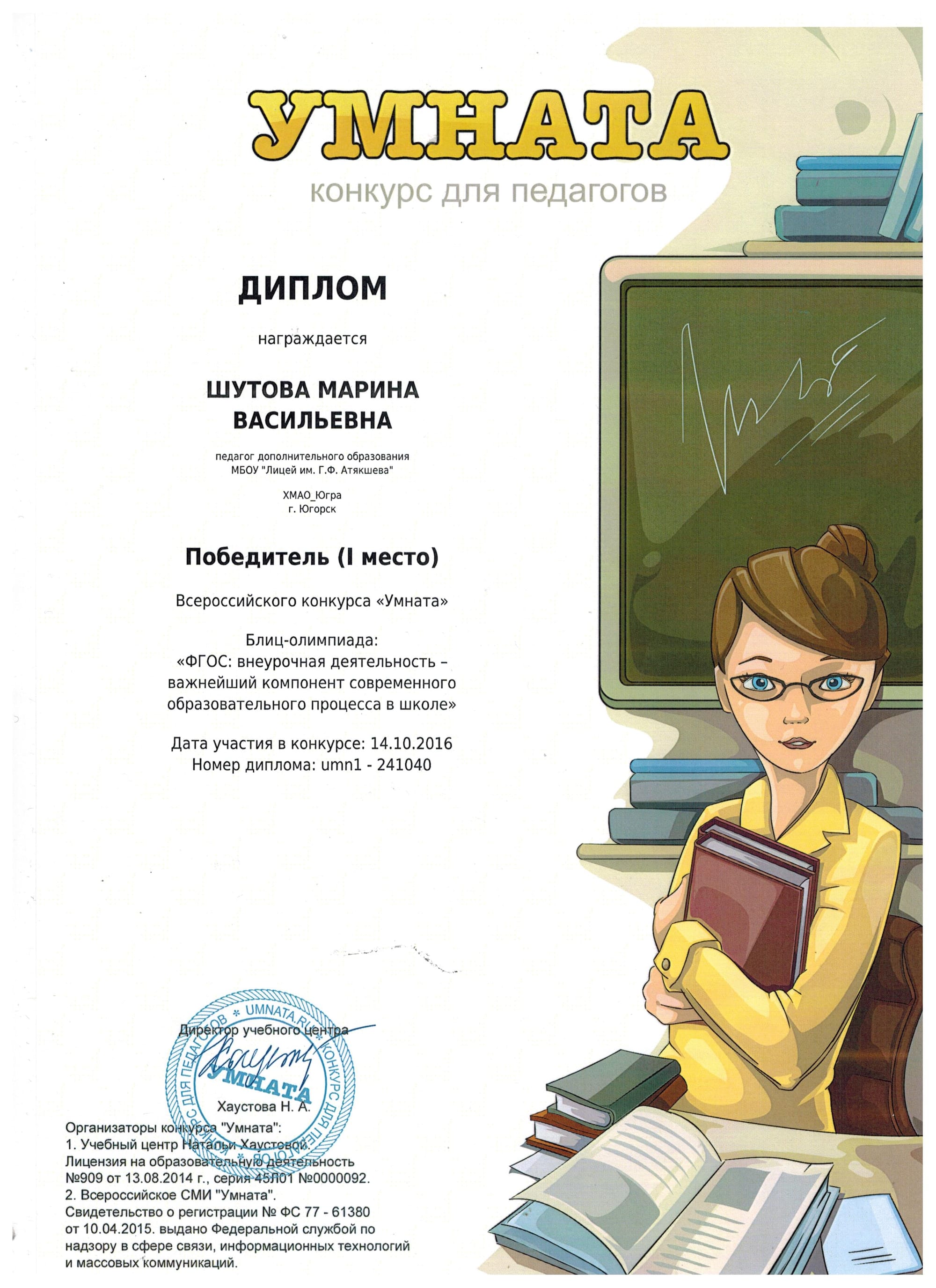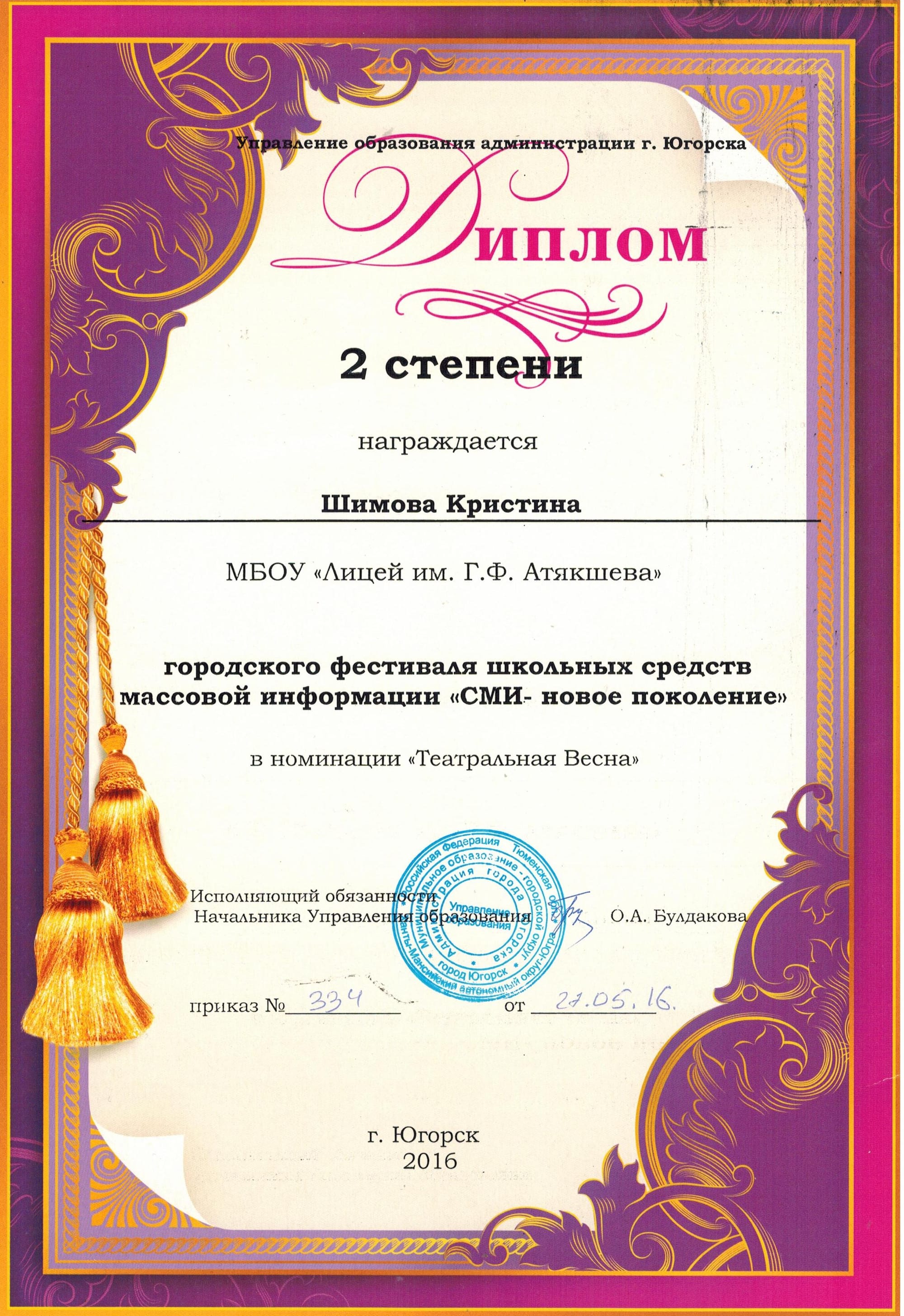 Благодарность директора Лицея им. Г.Ф. Атякшева за активное участие а проектировании и реализации инициатив, связанных с эффективностью работы дополнительного образования в МБОУ №Лицей им. Г.Ф. Атякшева»;