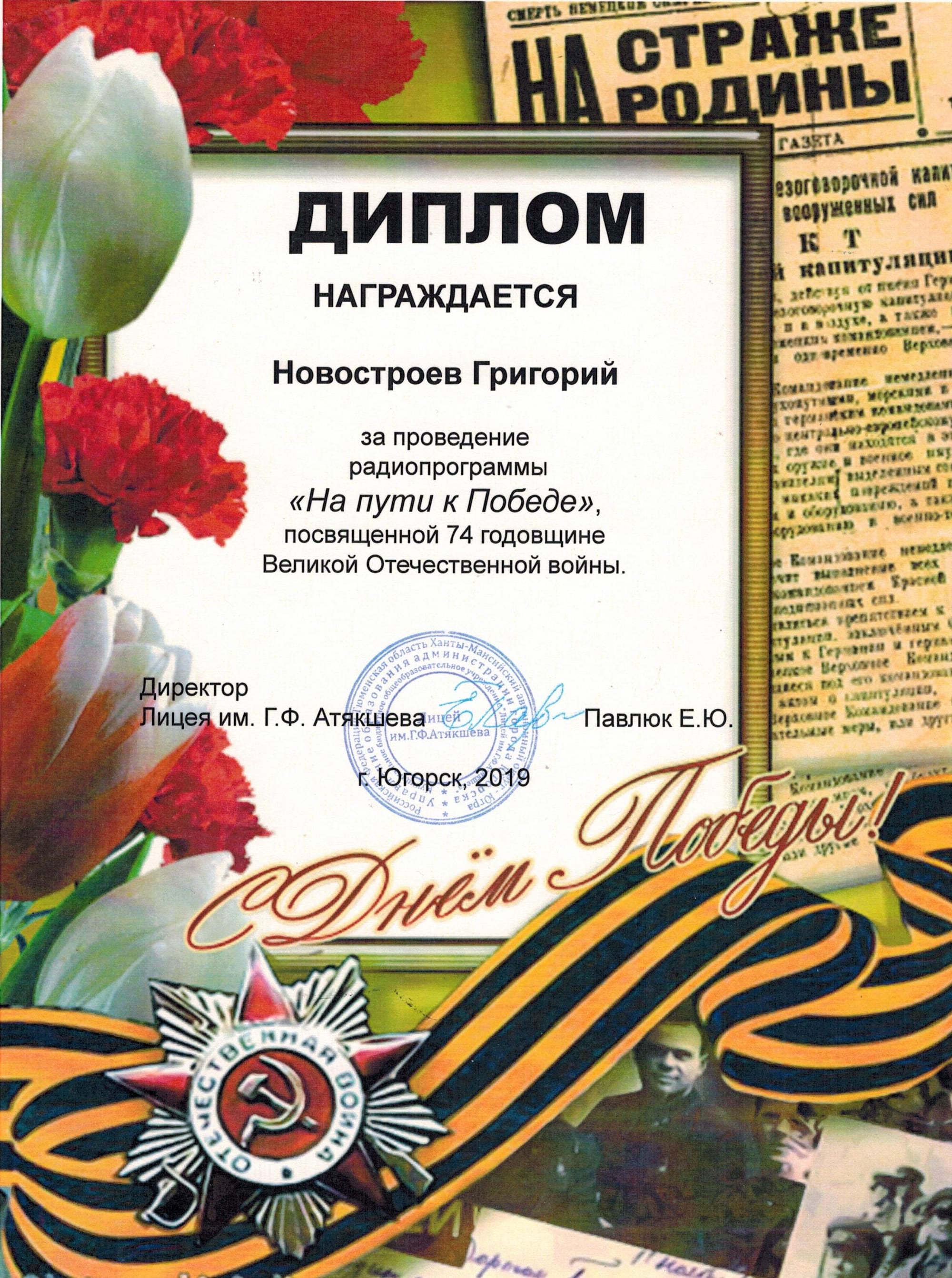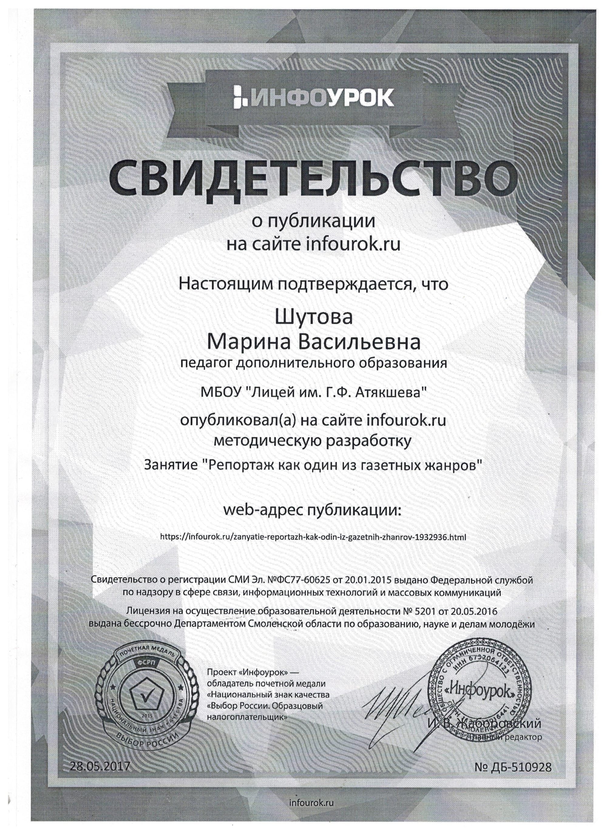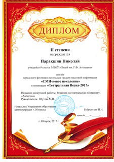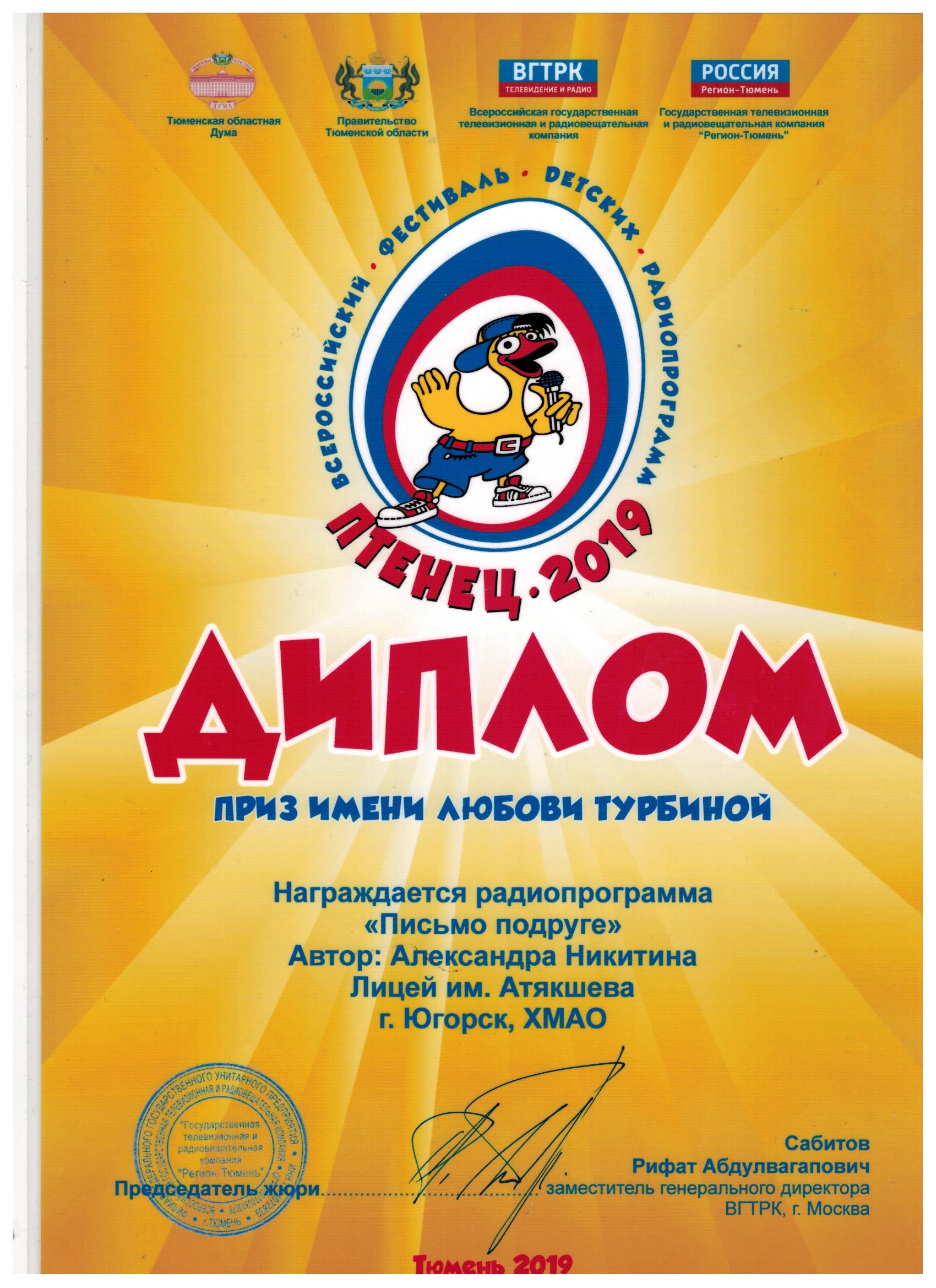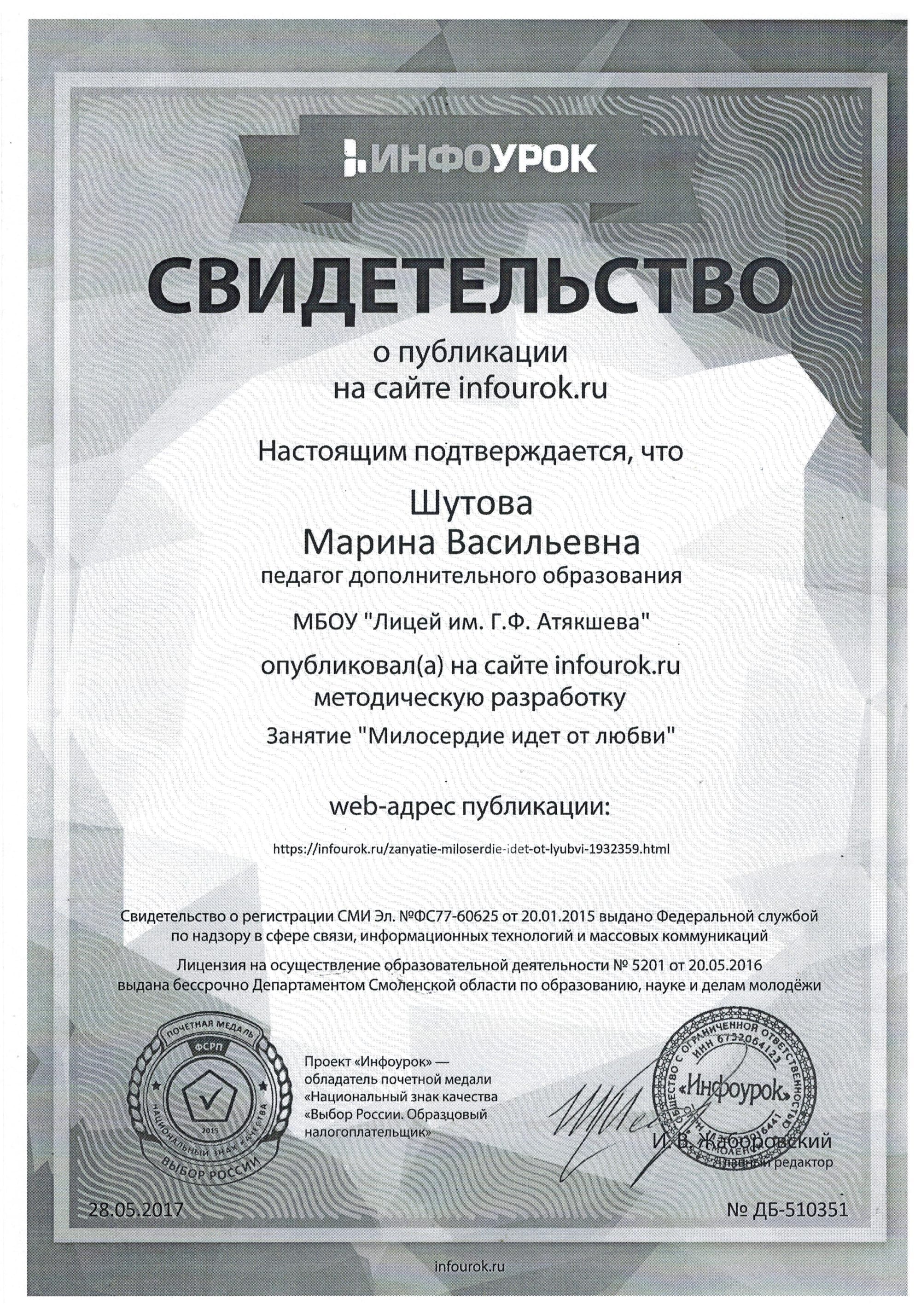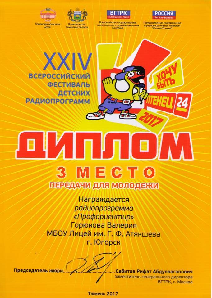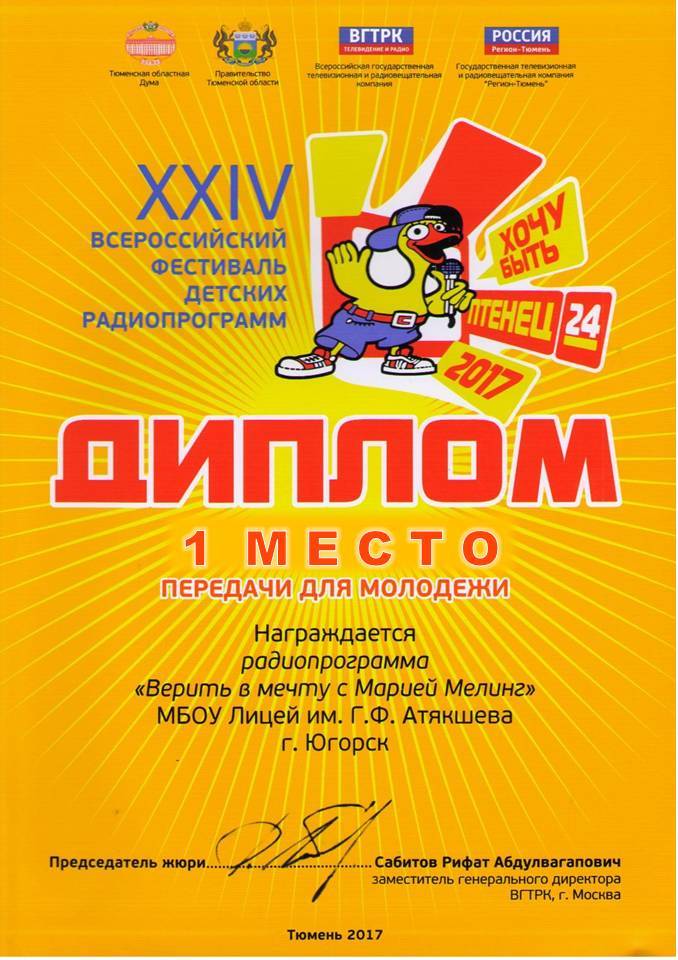 Благодарность директора Лицея им. Г.Ф. Атякшева за активное участие а проектировании и реализации инициатив, связанных с эффективностью работы дополнительного образования в МБОУ №Лицей им. Г.Ф. Атякшева»;