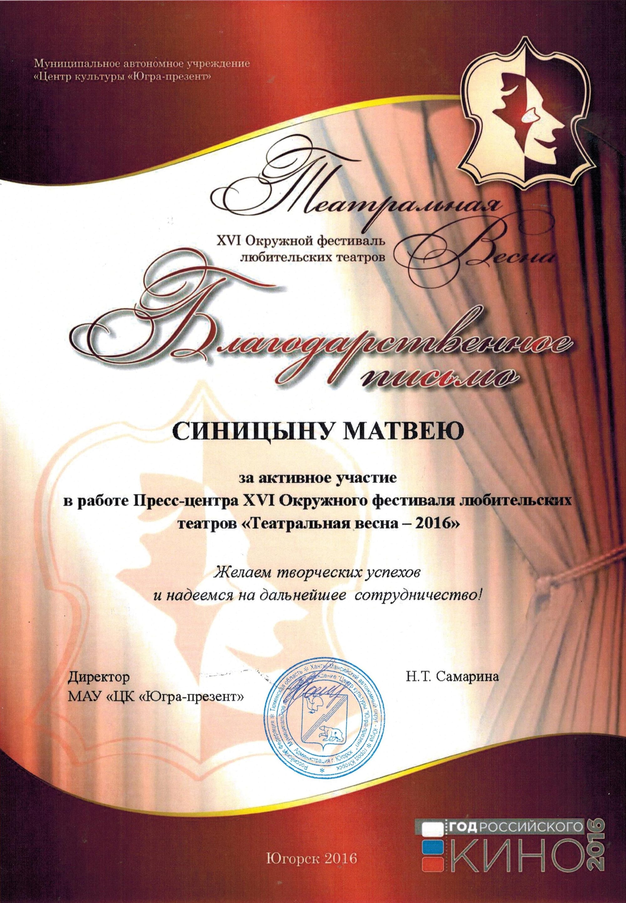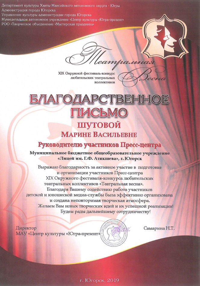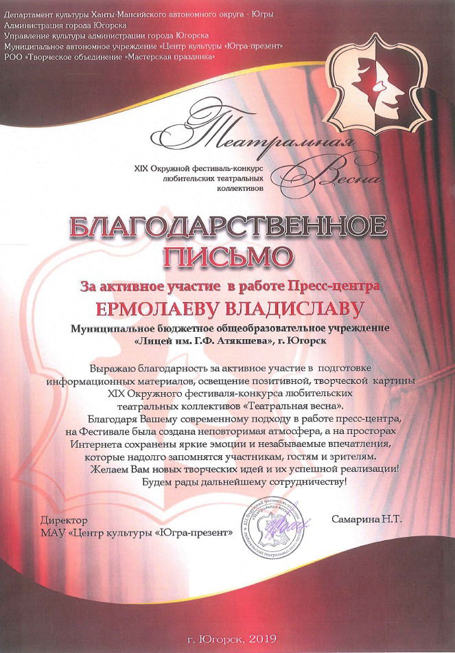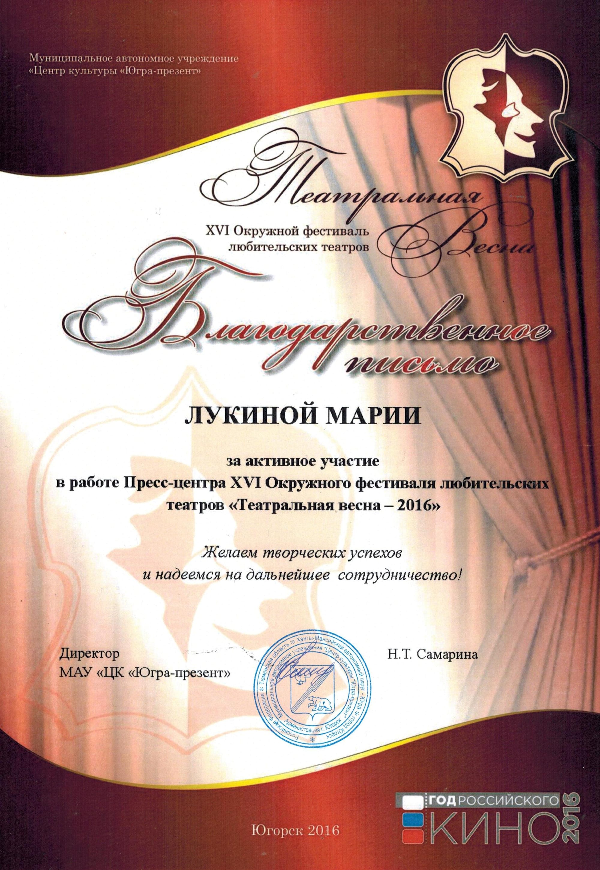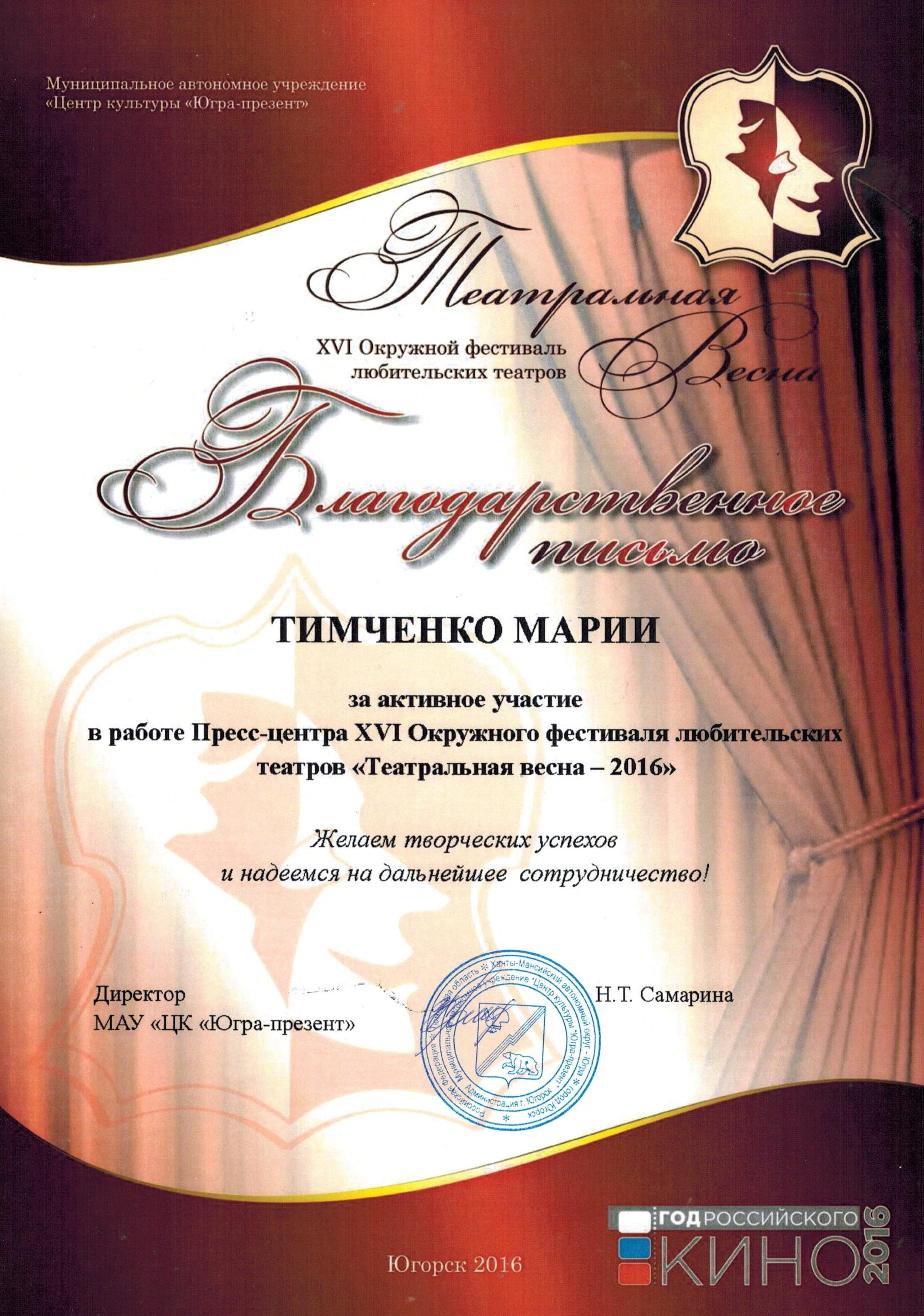 Благодарственное письмо директора МАУ «Центр культуры «Югра-презент» за активное участие в подготовке и организации участников Пресс-центра XIX Окружного фестиваля-конкурса любительских театральных коллективов «Театральная весна».