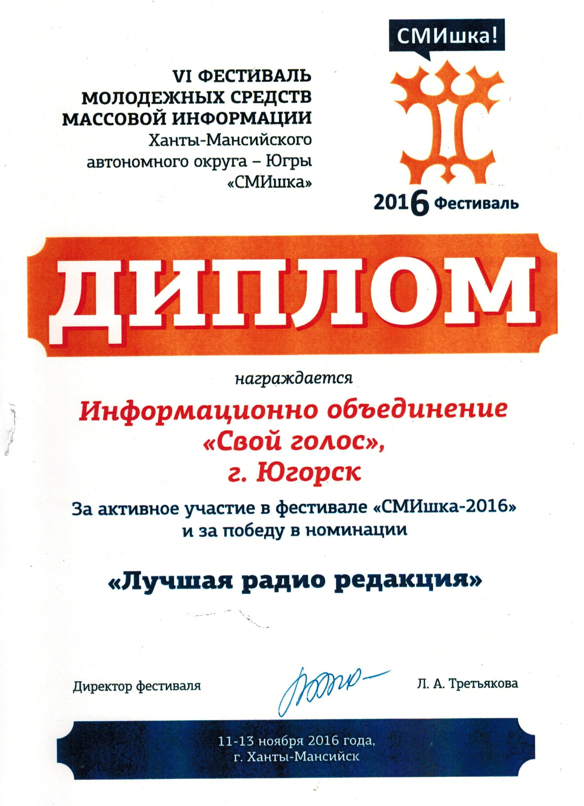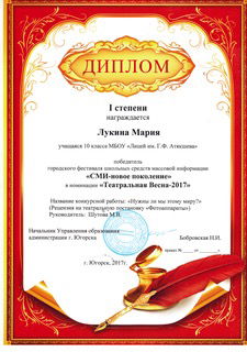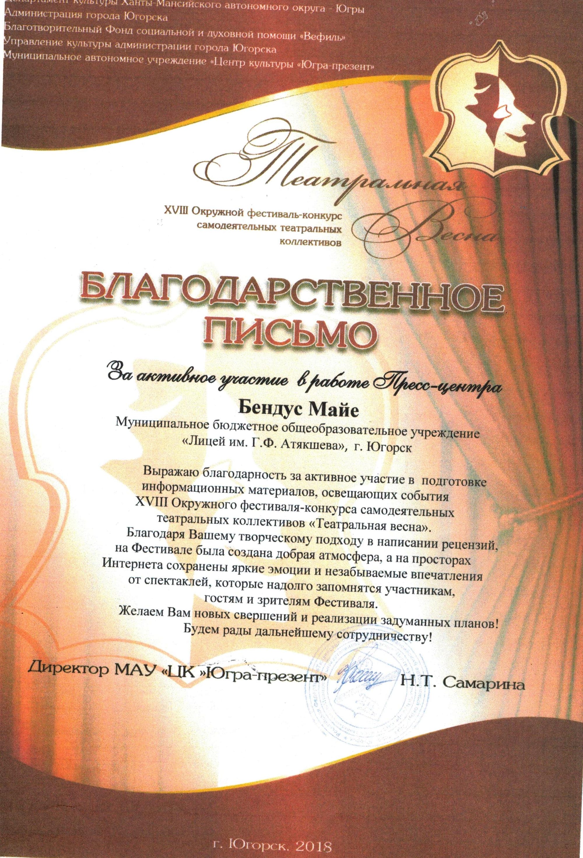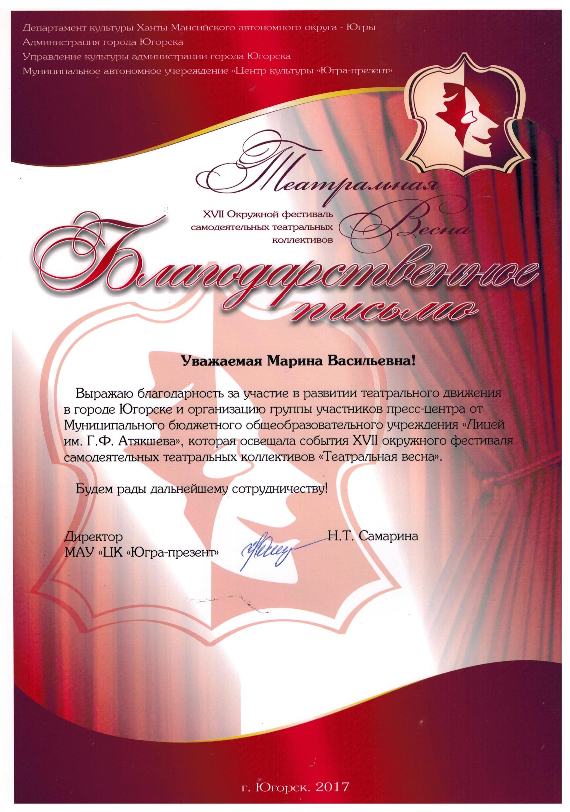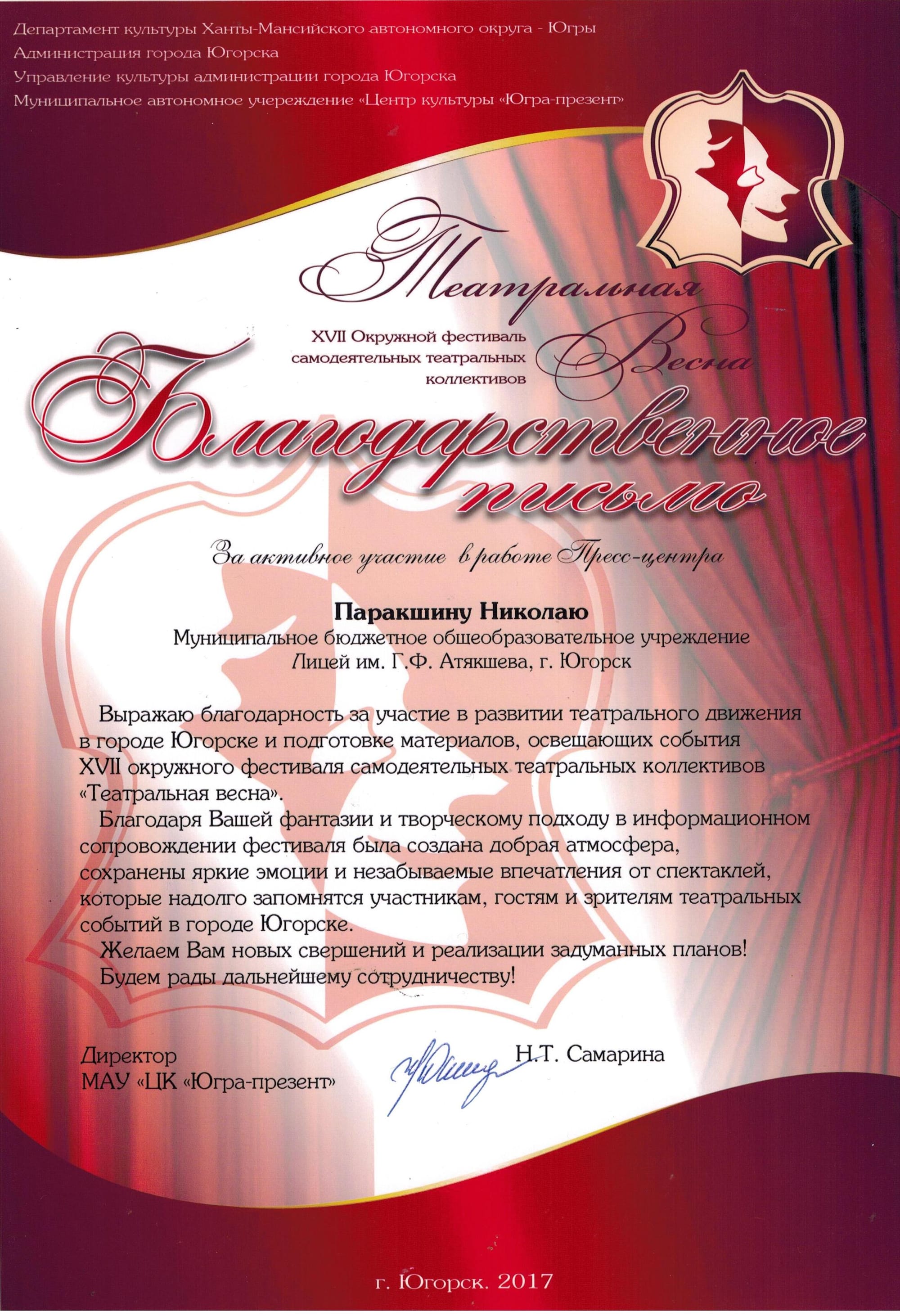Благодарственное письмо директора МАУ «Центр культуры «Югра-презент» за активное участие в подготовке и организации участников Пресс-центра XIX Окружного фестиваля-конкурса любительских театральных коллективов «Театральная весна».