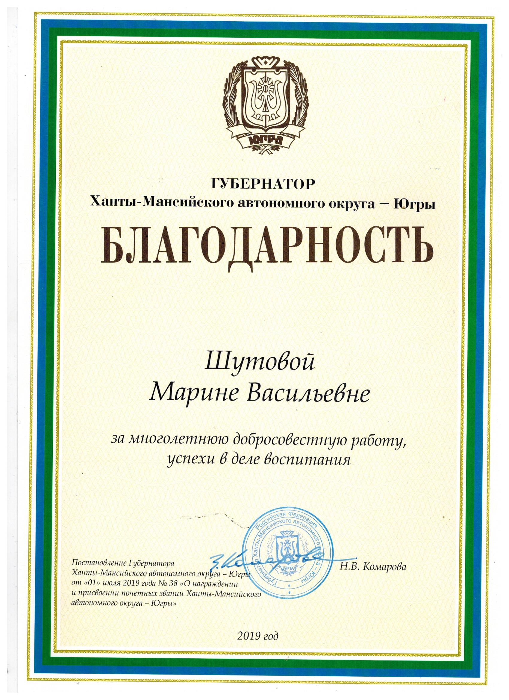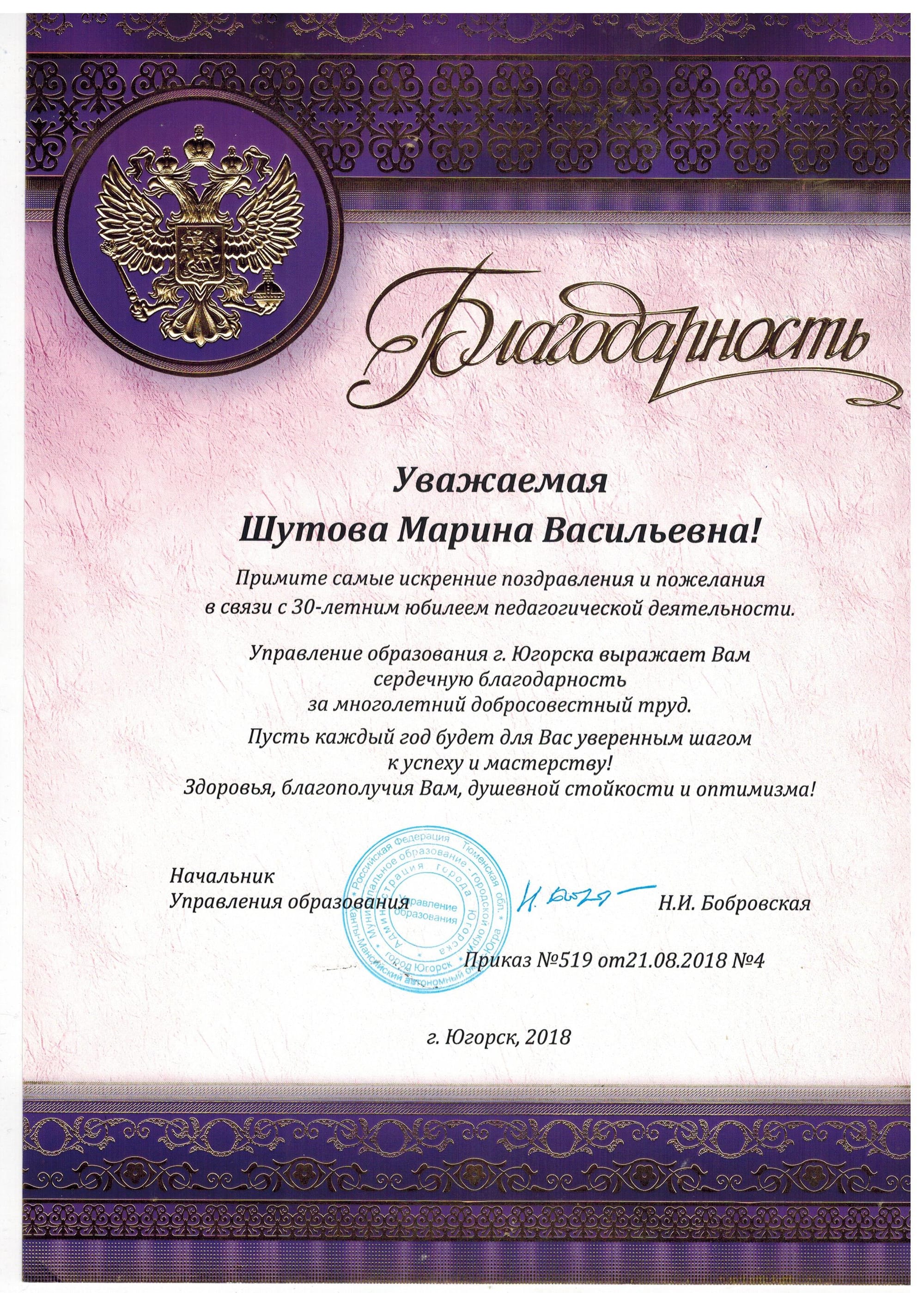 Благодарность начальника Управления образования Администрации города Югорска ха многолетний добросовестный труд;