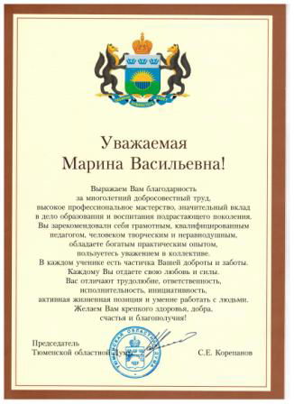 Благодарственное письмо Тюменской областной Думы за высокое профессиональное мастерство;