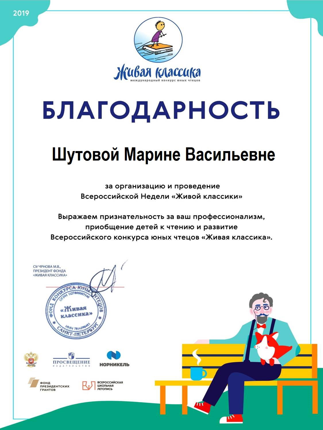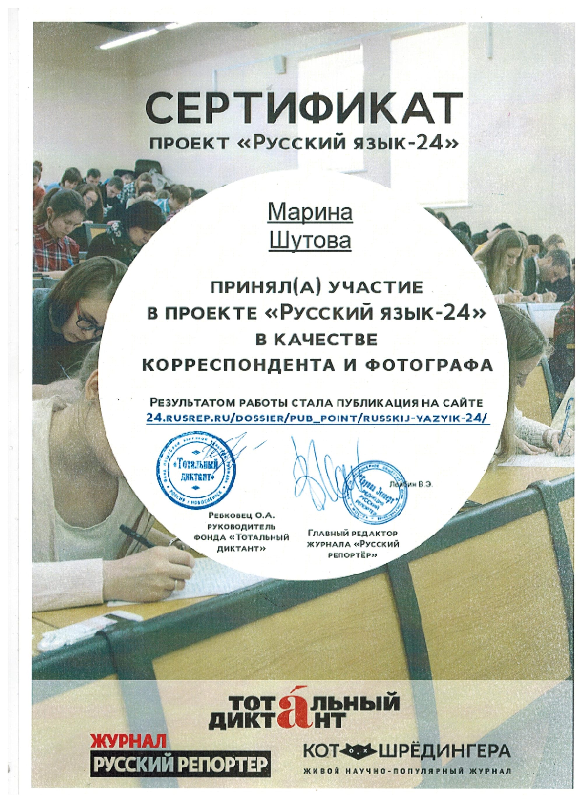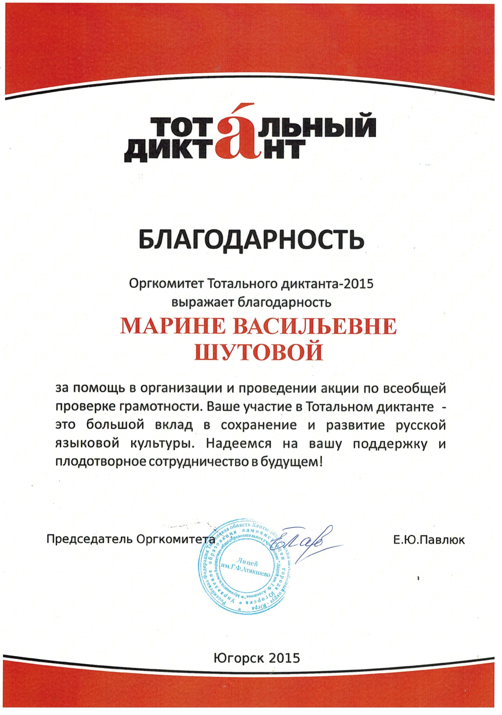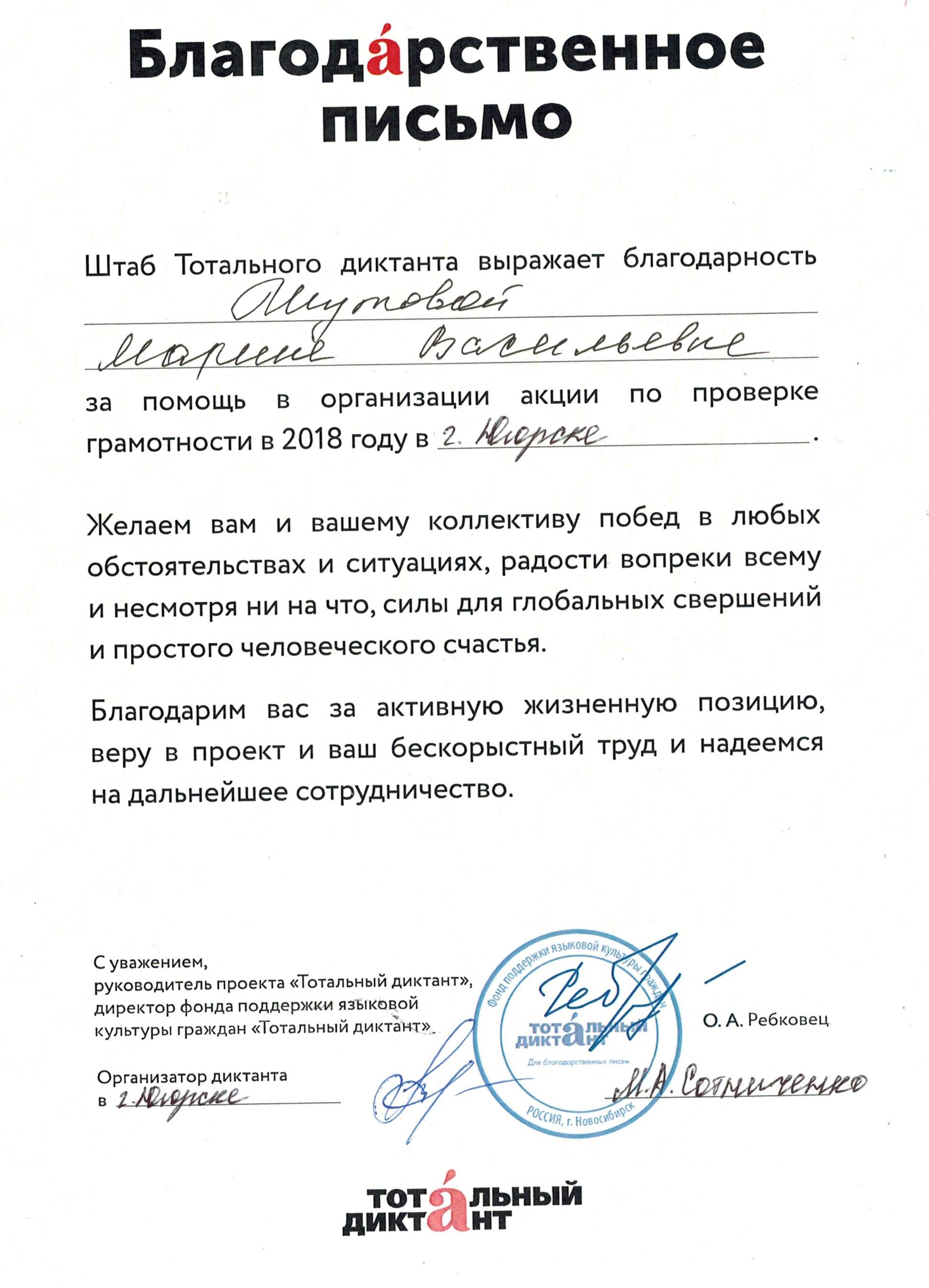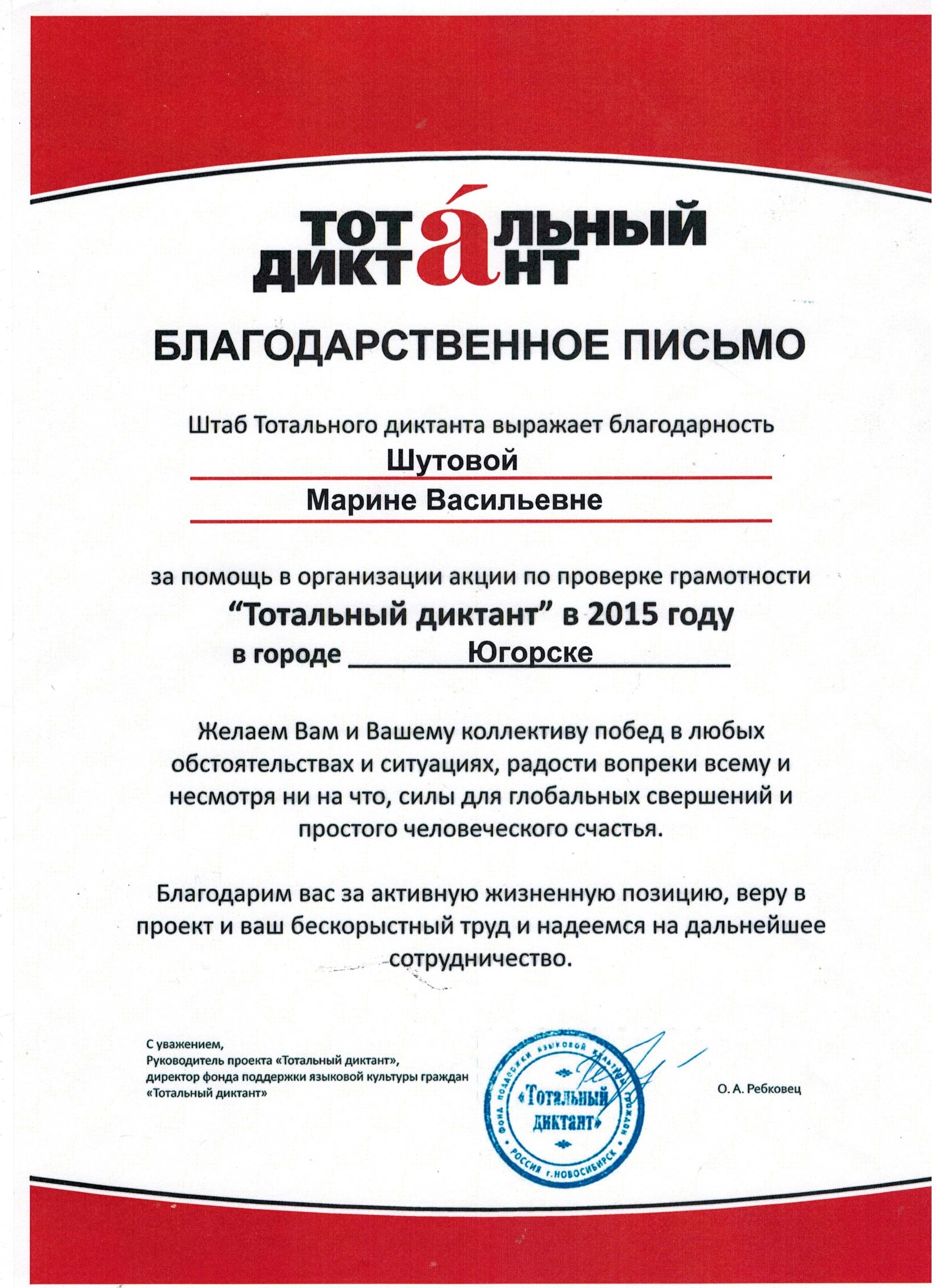 Благодарственное письмо руководителя проекта «Тотальный диктант», директора фонда поддержки языковой культуры граждан;