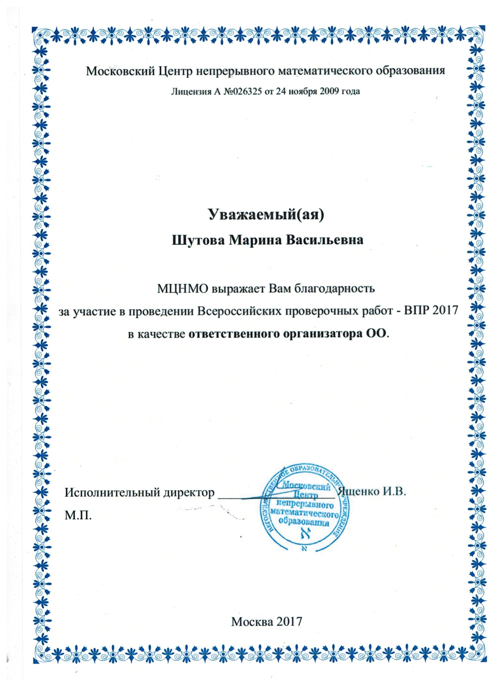 Благодарность Московского Центра непрерывного математического образования за участие в проведении Всероссийских проверочных работ – ВПР в качестве ответственного организатора ОО;