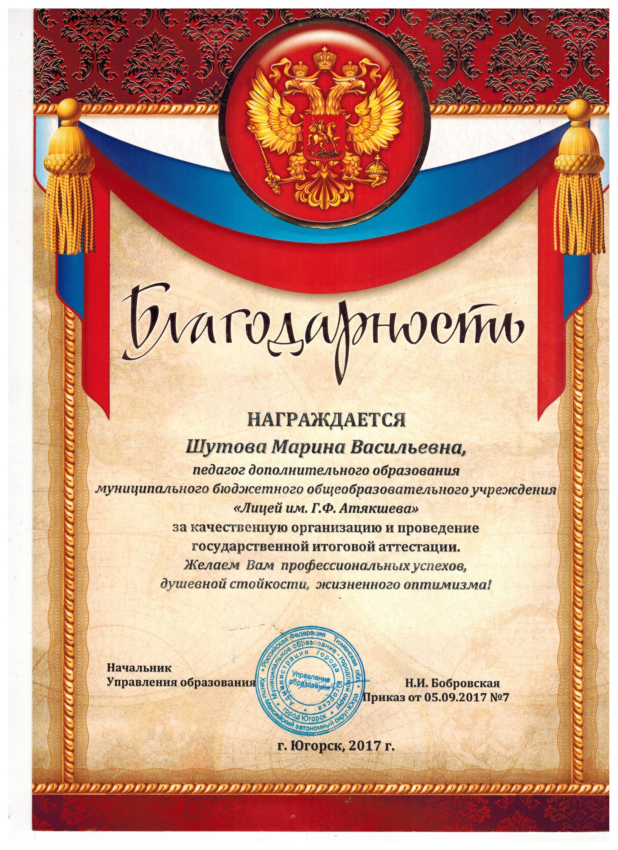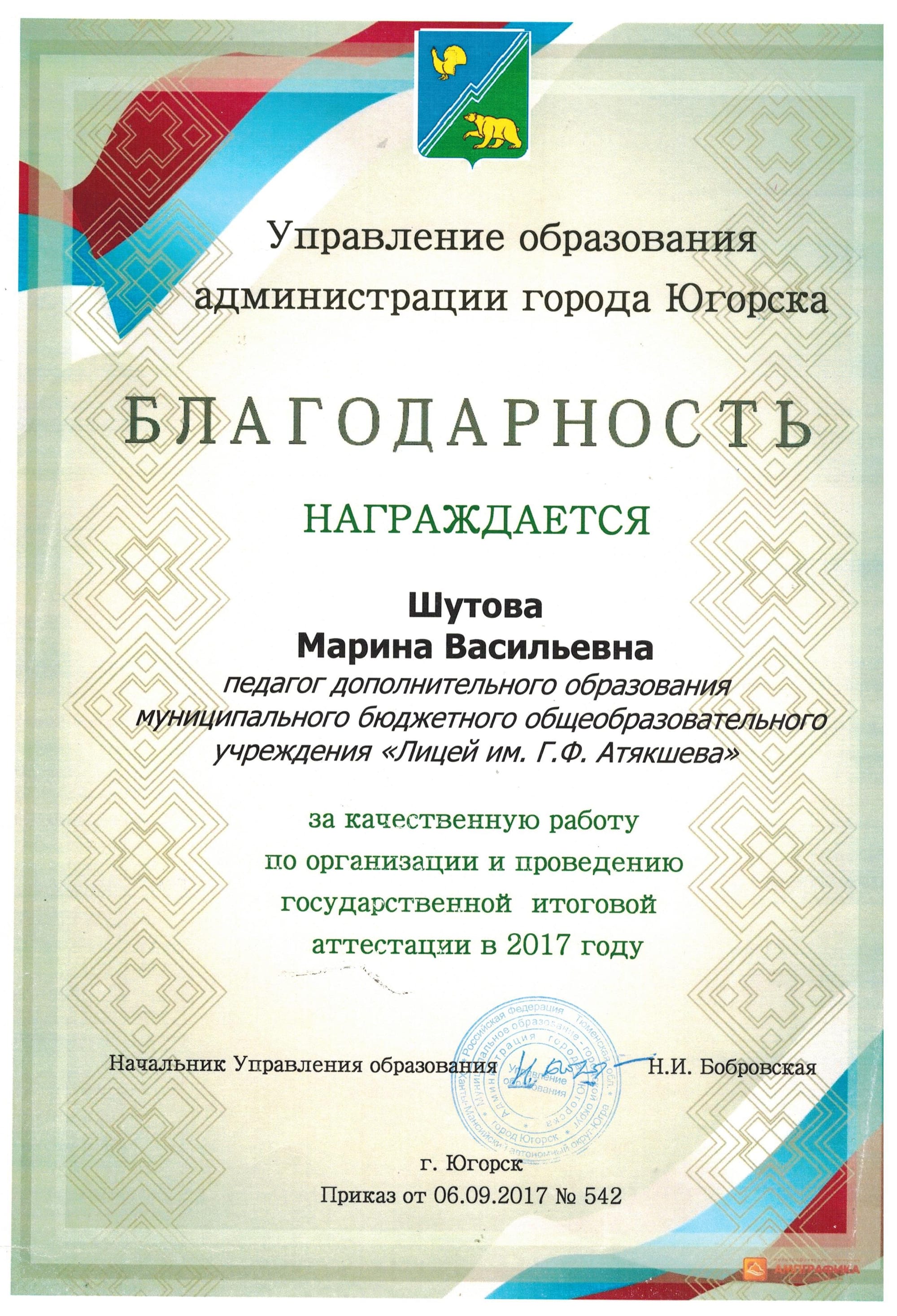Благодарность Управления образования администрации города Югорска за качественную работу по организации и проведению государственной итоговой аттестации;