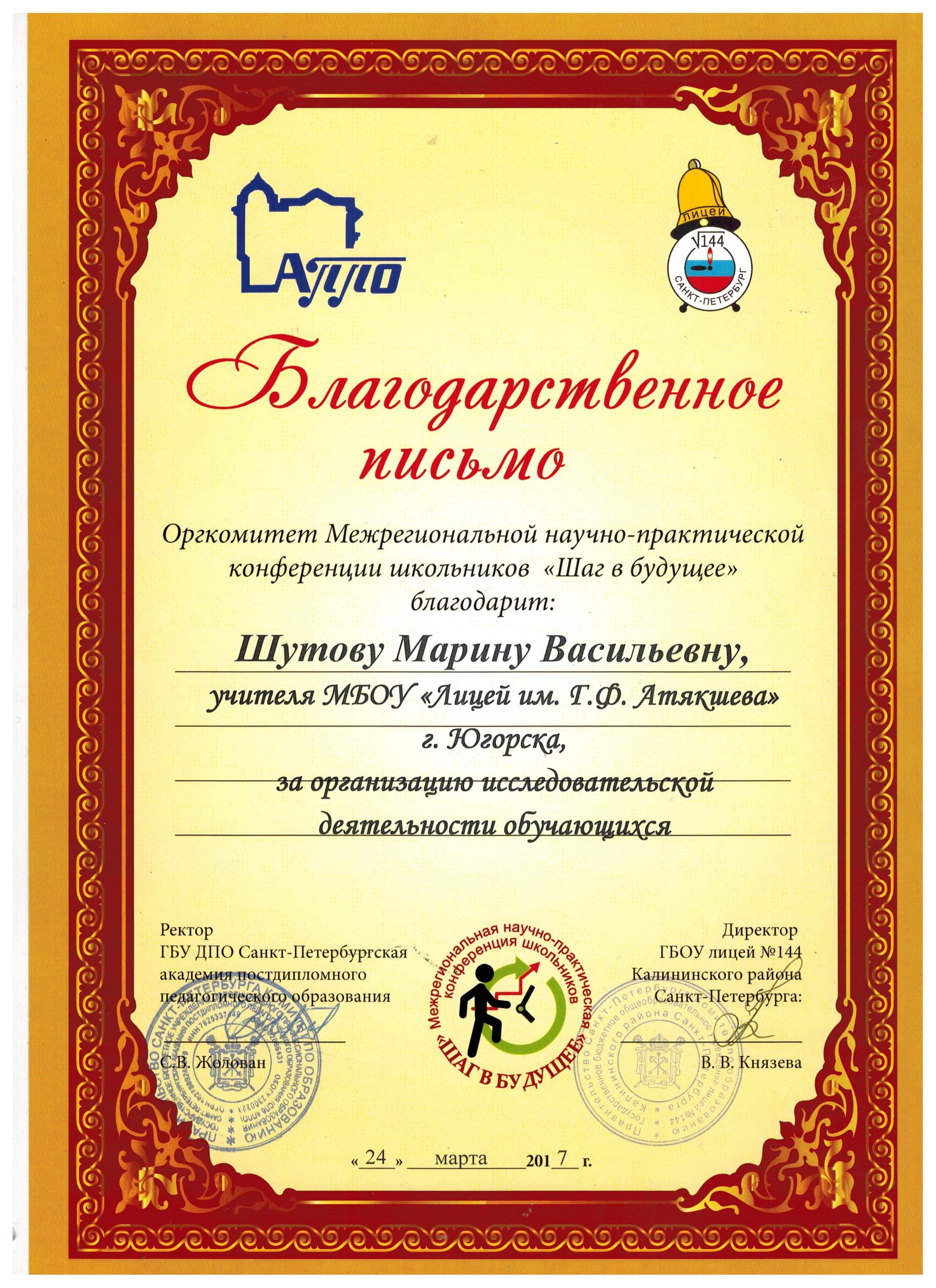 Благодарственное письмо оргкомитета Межрегиональной научно-практической конференции школьников «Шаг в будущее» за организацию исследовательской деятельности обучающихся г. Санкт-Петербург;