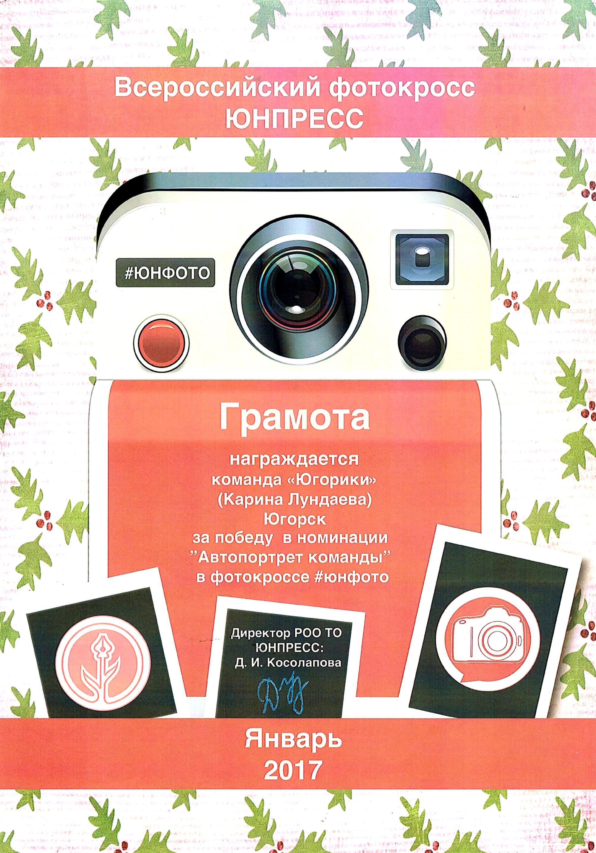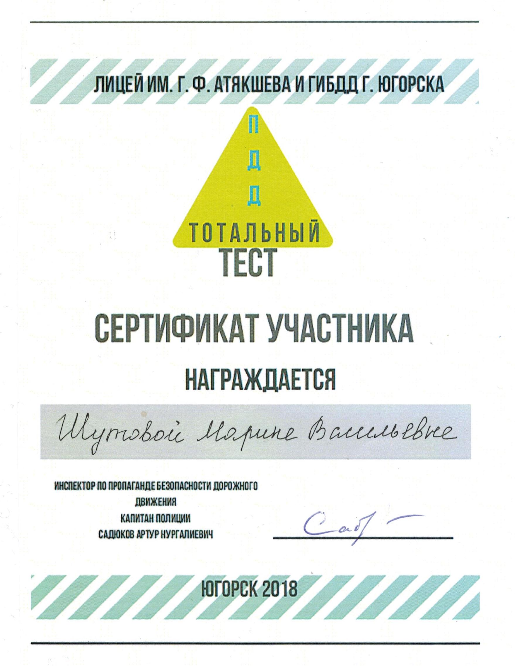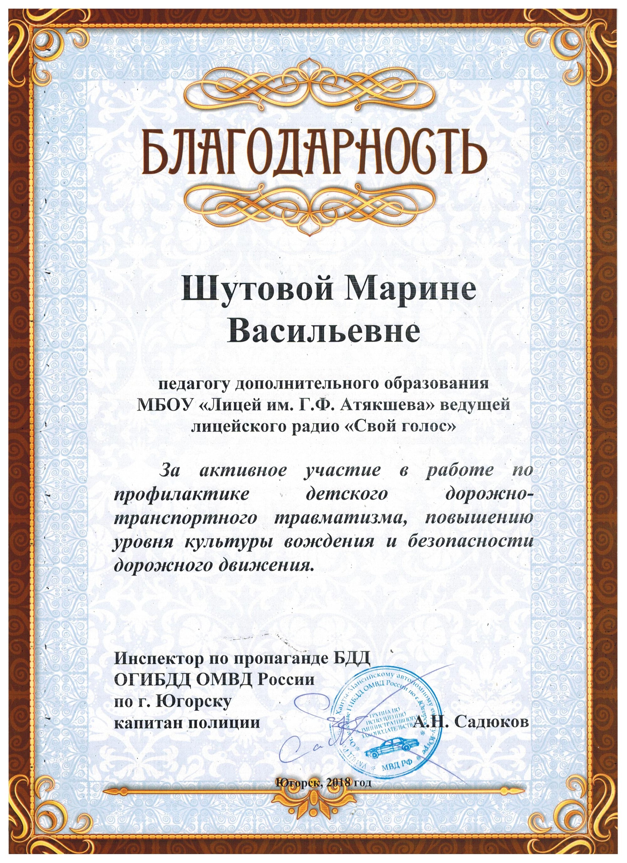 Благодарность инспектора по пропаганде БДД ОГИБДД ОМВД России по г. Югорску за активное участие в работе по профилактике детского дорожно-транспортного травматизма, повышению уровня культуры вождения и безопасности дорожного движения;