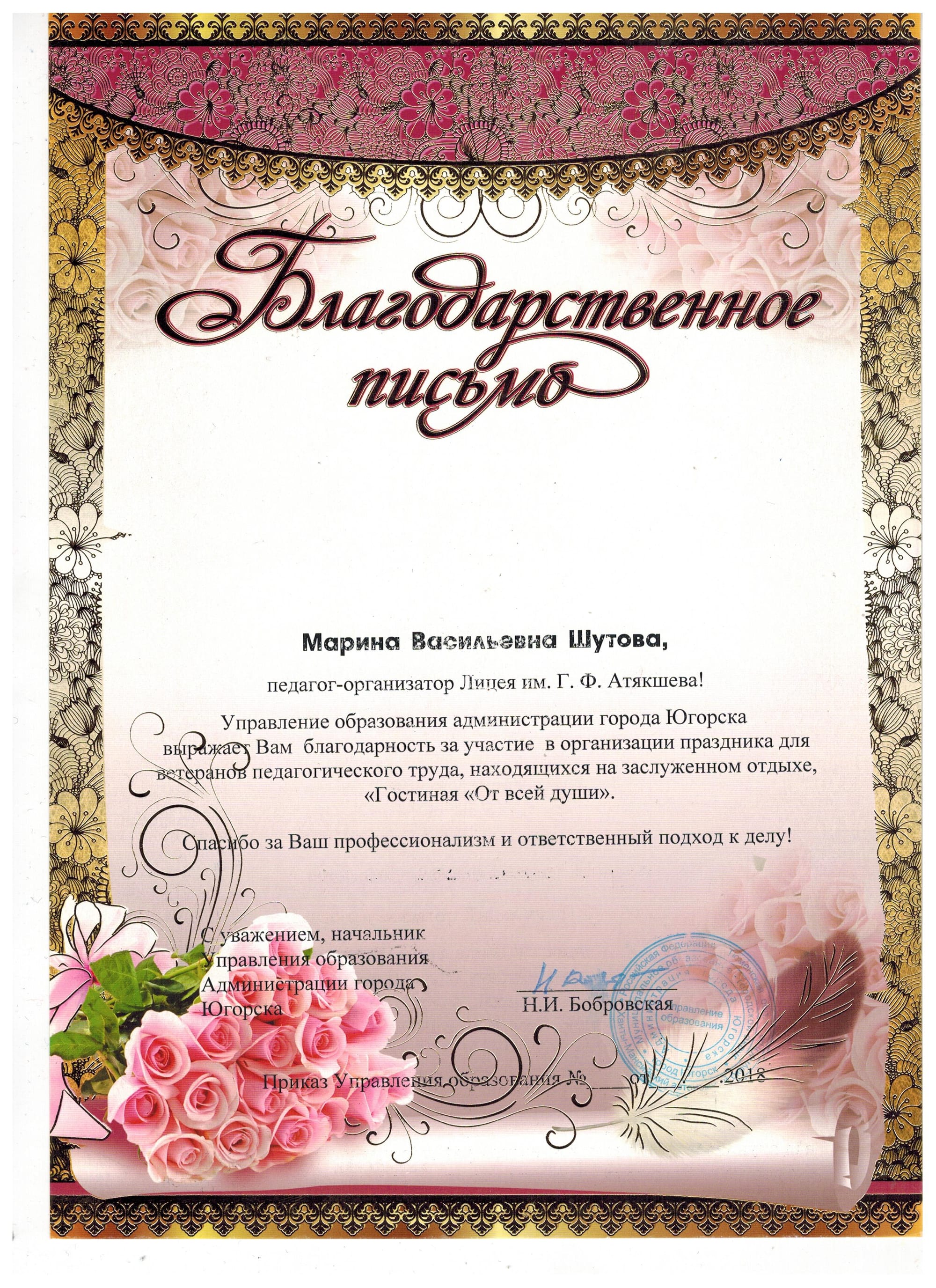 Благодарность начальника Управления образования Администрации города Югорска за участие в организации праздника для ветеранов педагогического труда, находящихся на заслуженном отдыхе;