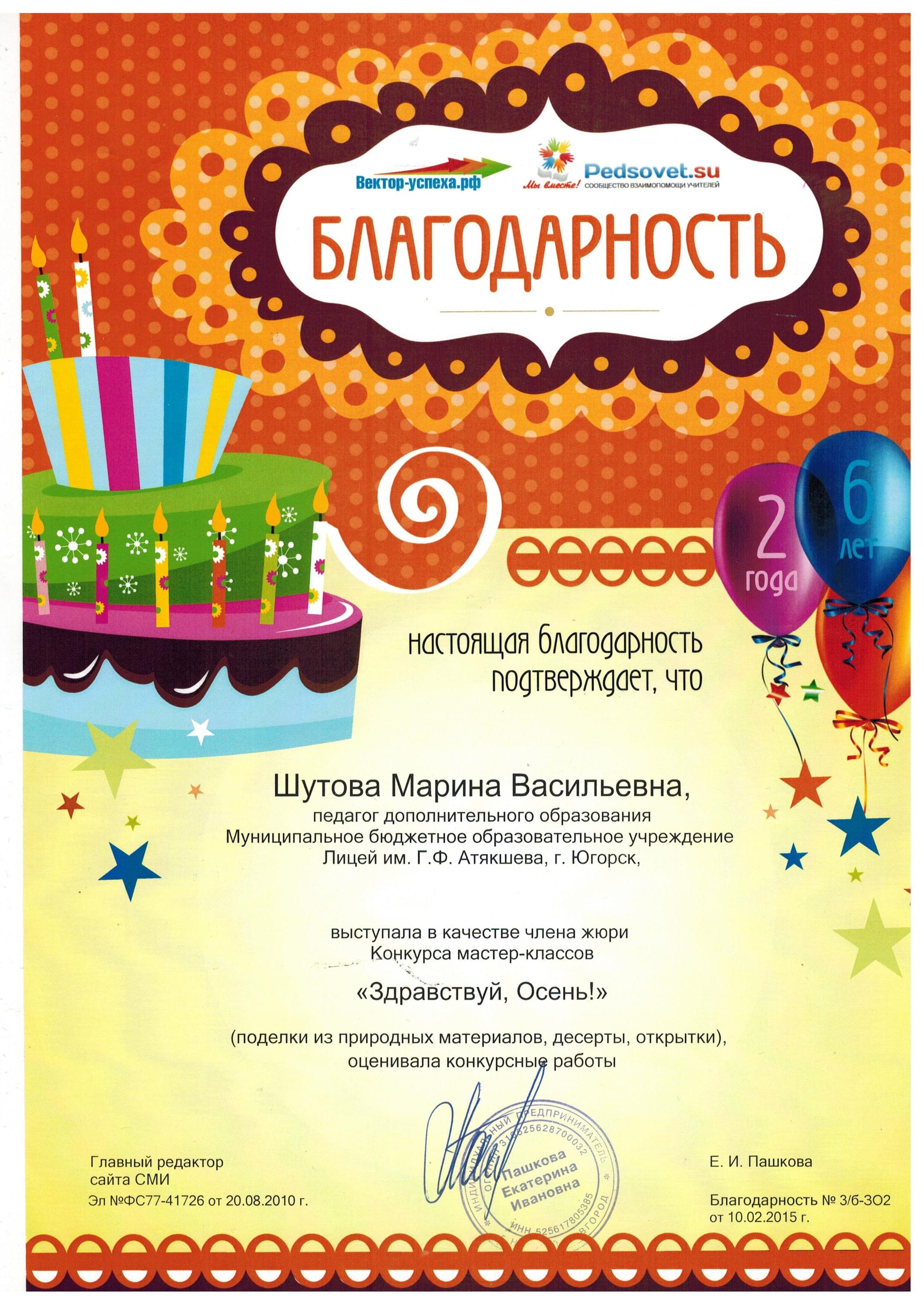 Благодарность главного редактора сайта СМИ Вектор-успеха.рф за качественную работу в качестве жюри Всероссийского конкурса мастер-классов;
