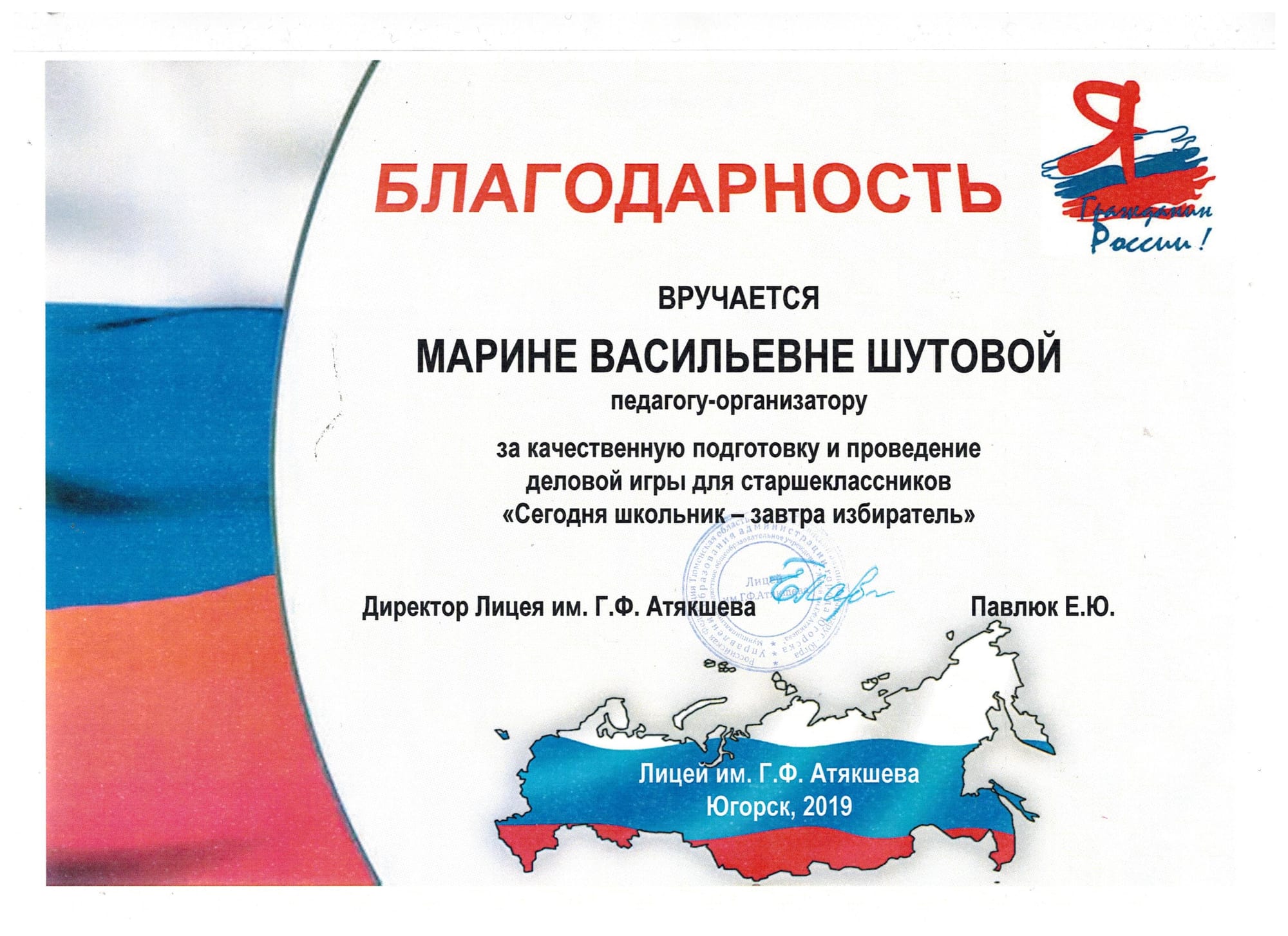 Благодарность директора Лицея им. Г.Ф. Атякшева за качественную подготовку и проведение деловой игры для старшеклассников «Сегодня школьник-завтра избиратель»;