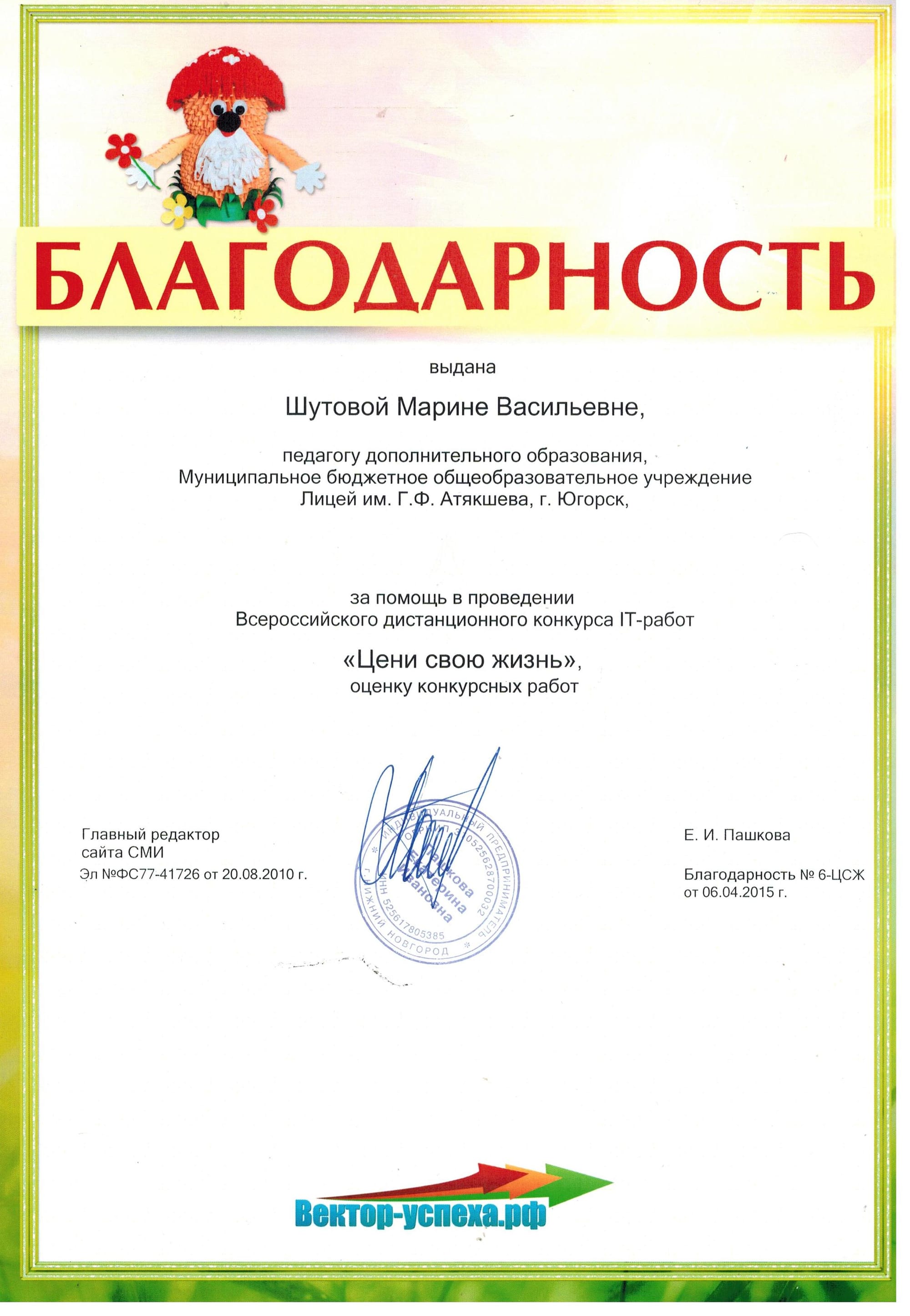 Благодарность главного редактора сайта СМИ Вектор-успеха.рф за помощь в проведении и оценке IT-работ «Цени свою жизнь» Всероссийского дистанционного конкурса;