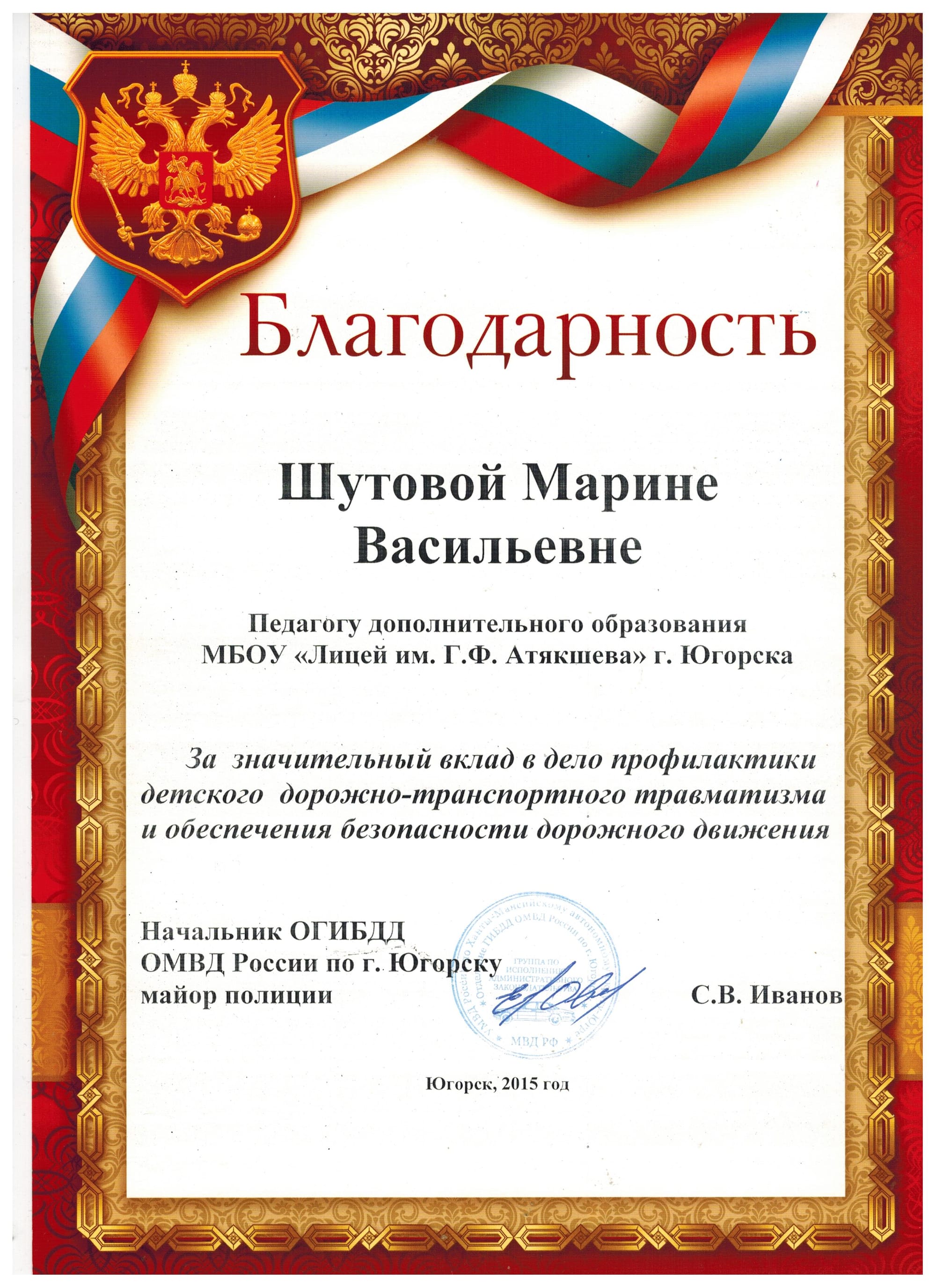 Благодарность начальника ОГИБДД ОМВД России по г. Югорску за значительный вклад в дело профилактики детского дорожно-транспортного травматизма и обеспечение безопасности дорожного движения;