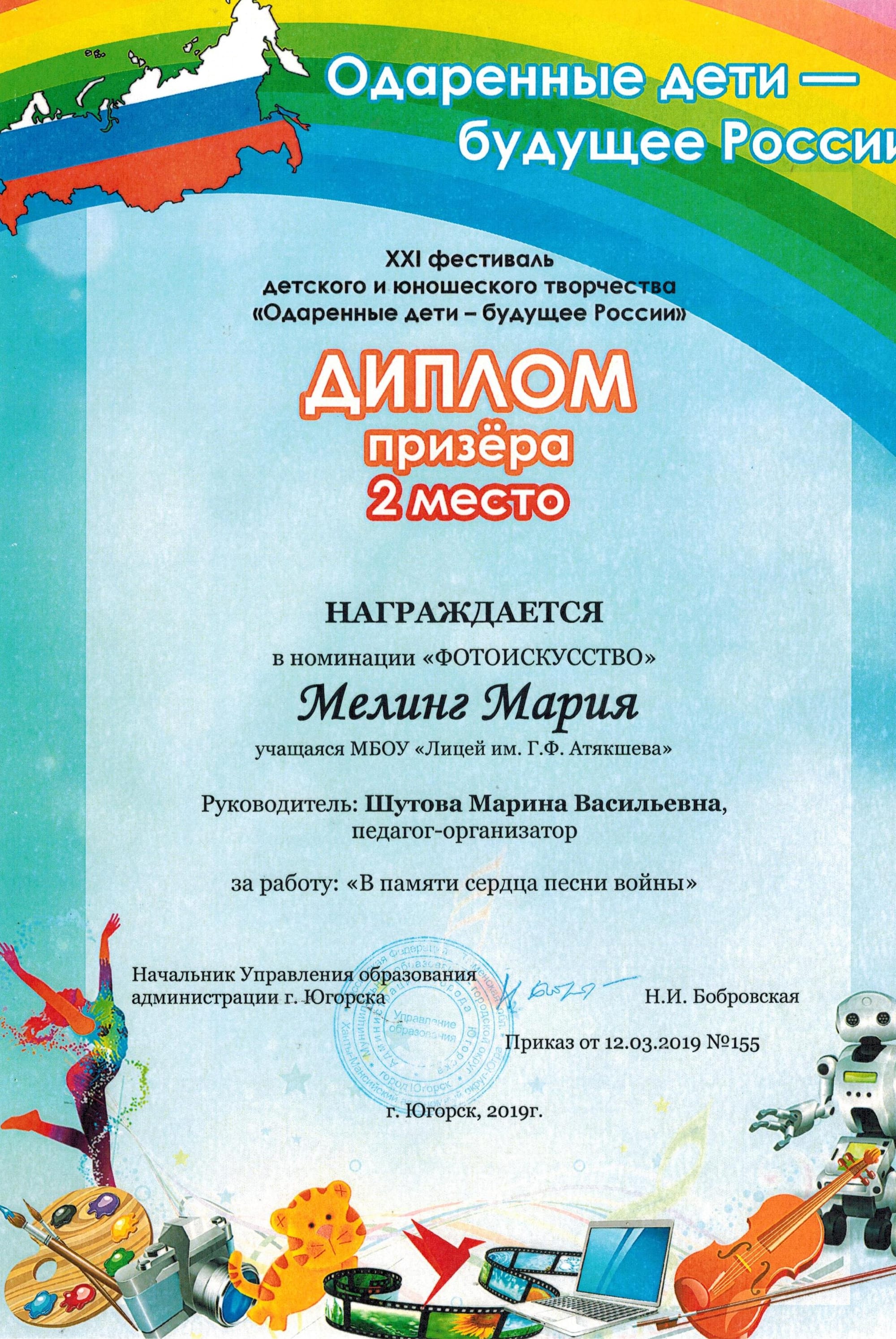 Сведения о награждениях:Благодарность Губернатора Ханты-Мансийского автономного округа - Югры за многолетнюю добросовестную работу, успехи в деле воспитания: